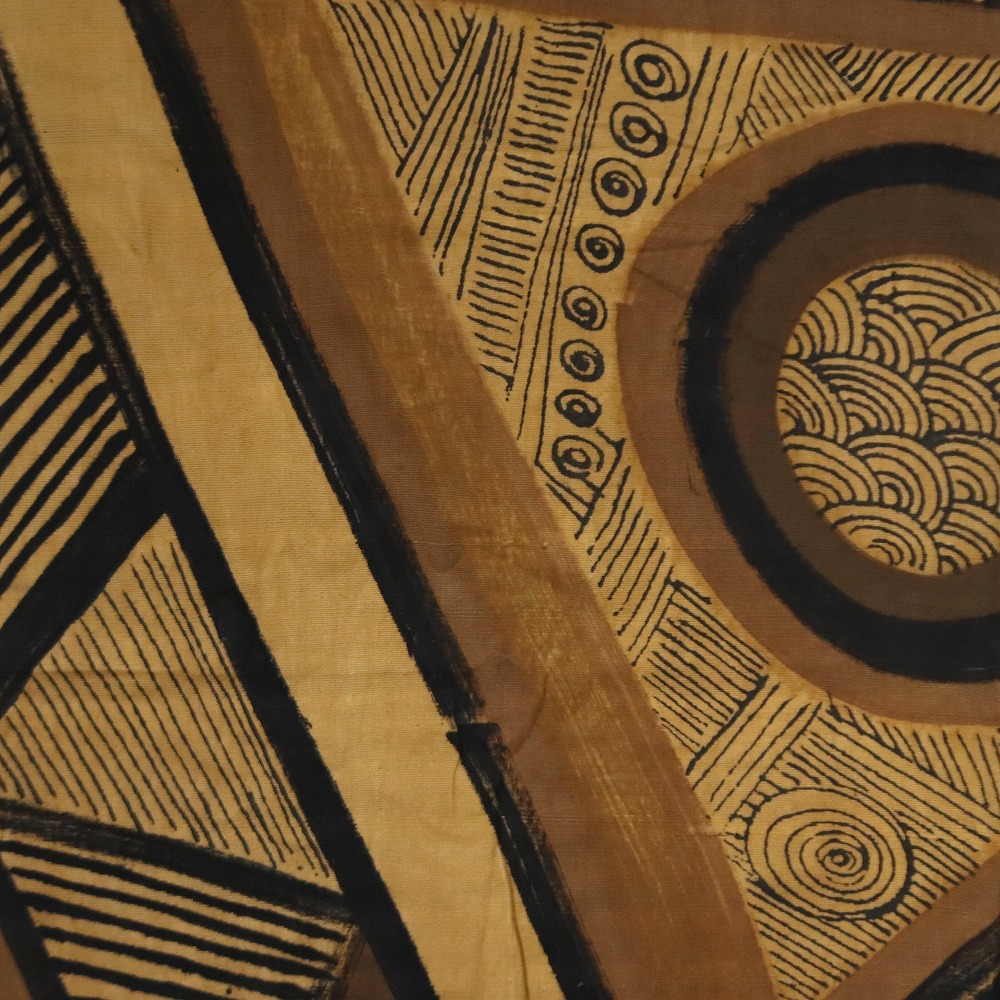 手織り布にガラマの葉で黄色く染める。→その上に泥で柄を描く→陽光にしばらくさらす。→ 水洗いすると、泥の柄がくっきり出る→何度もこの工程を繰り返す→泥染めの黒が定着