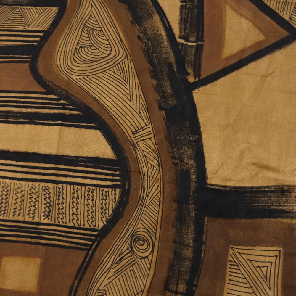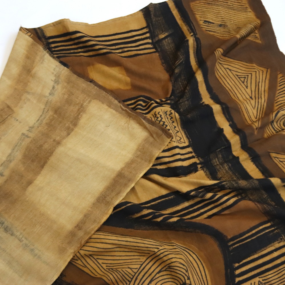 手織り布にガラマの葉で黄色く染める。→その上に泥で柄を描く→陽光にしばらくさらす。→ 水洗いすると、泥の柄がくっきり出る→何度もこの工程を繰り返す→泥染めの黒が定着