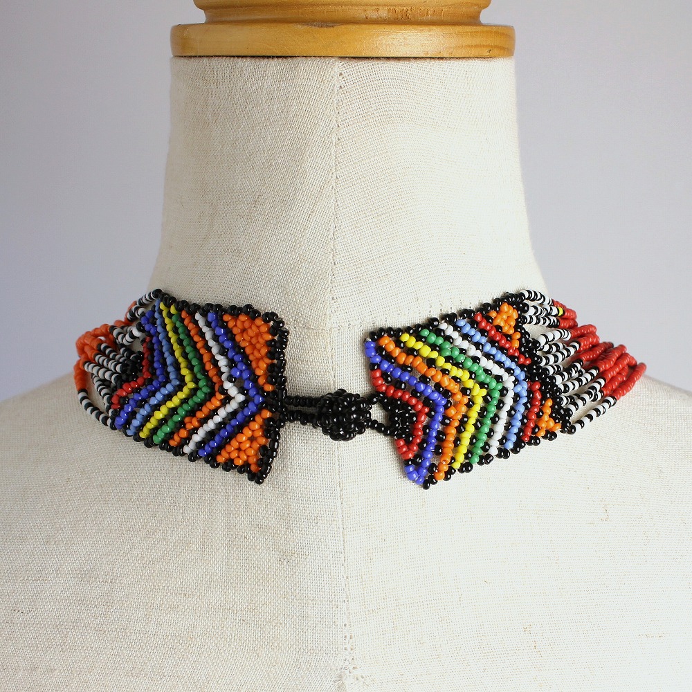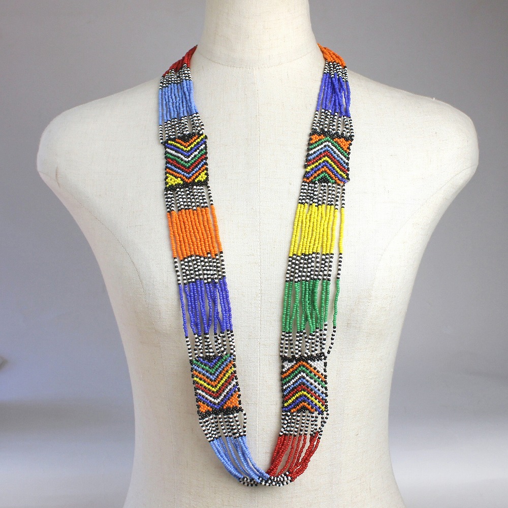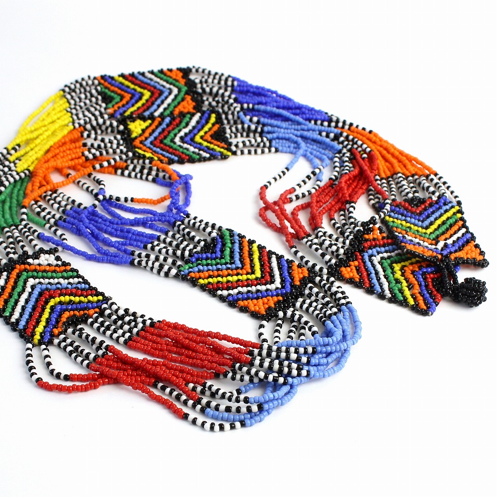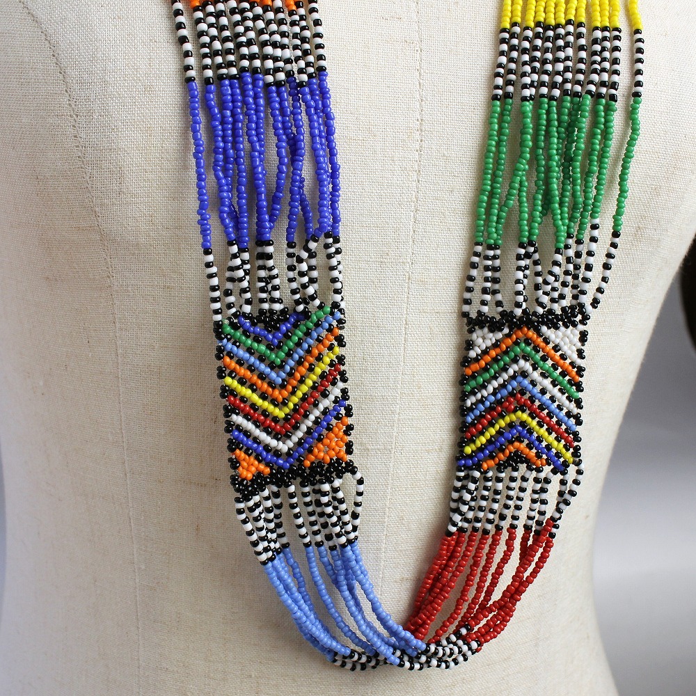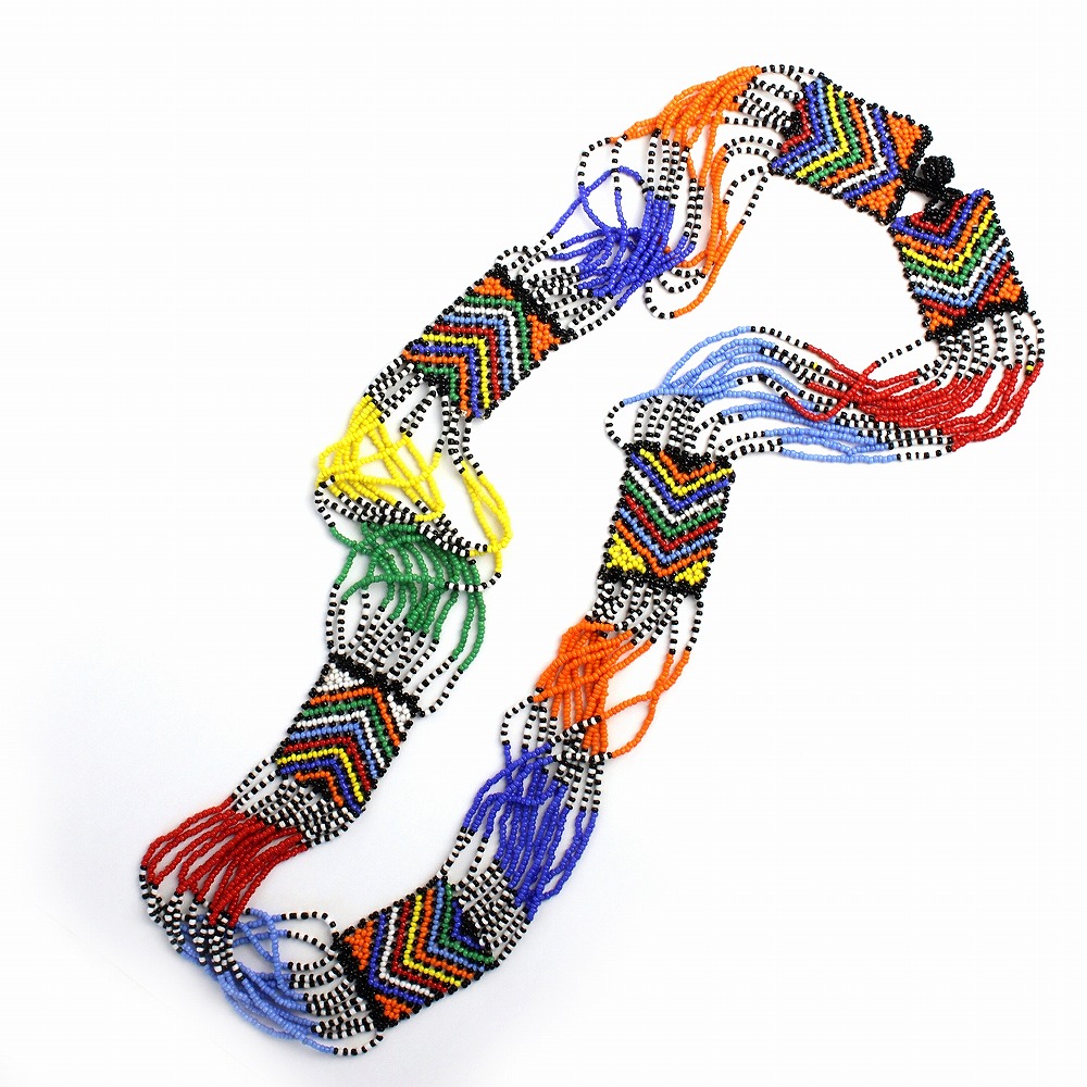 南アフリカのビーズを贅沢に使用したロングネックレスです。南アフリカの伝統柄が手作業で編みこまれたカラフルなビーズアクセサリーです。