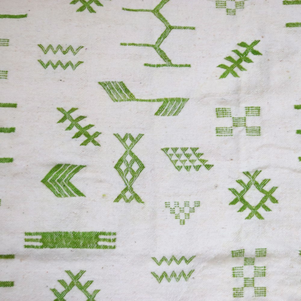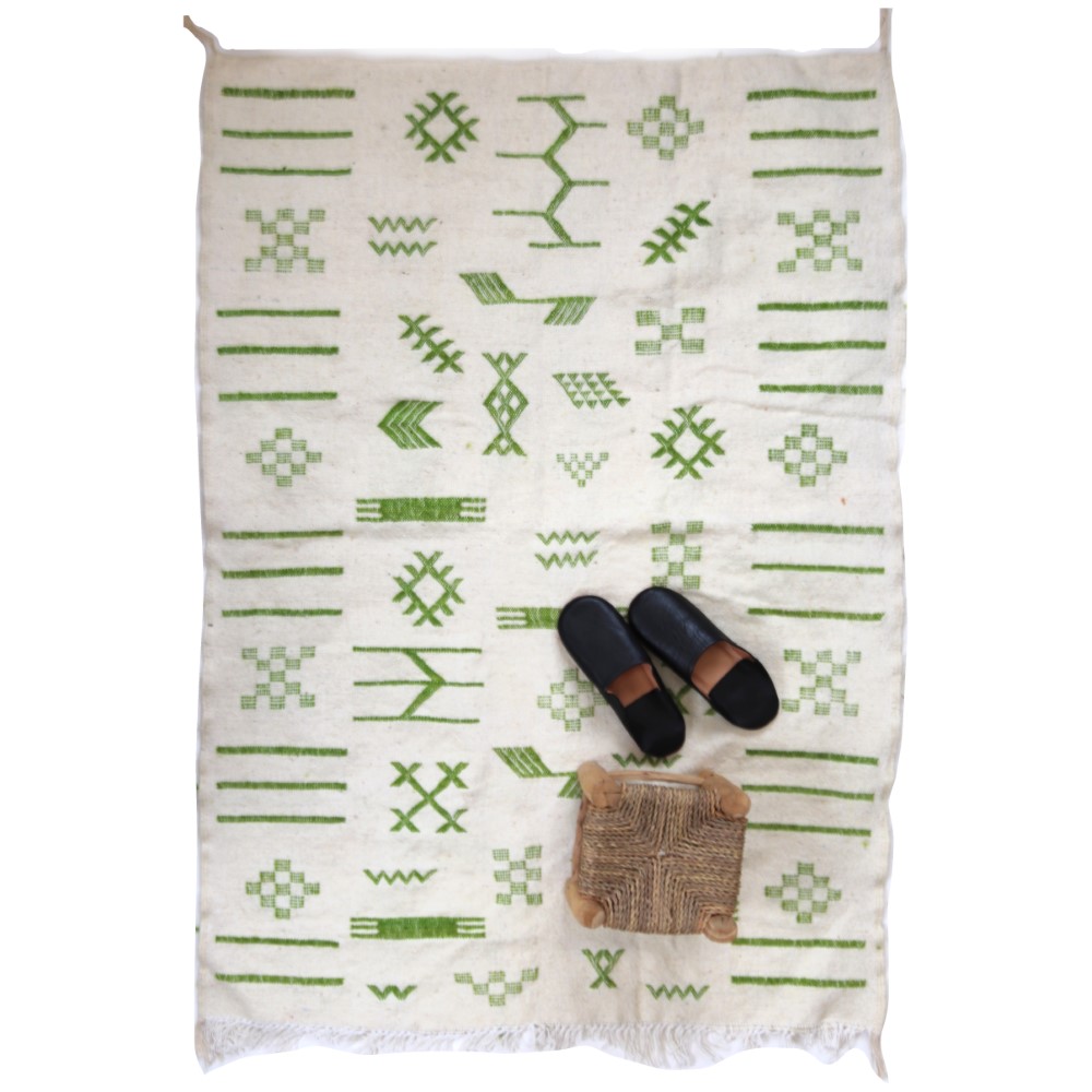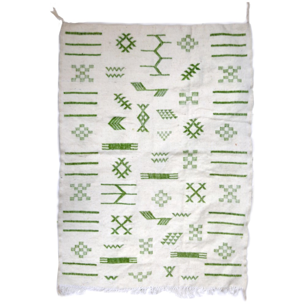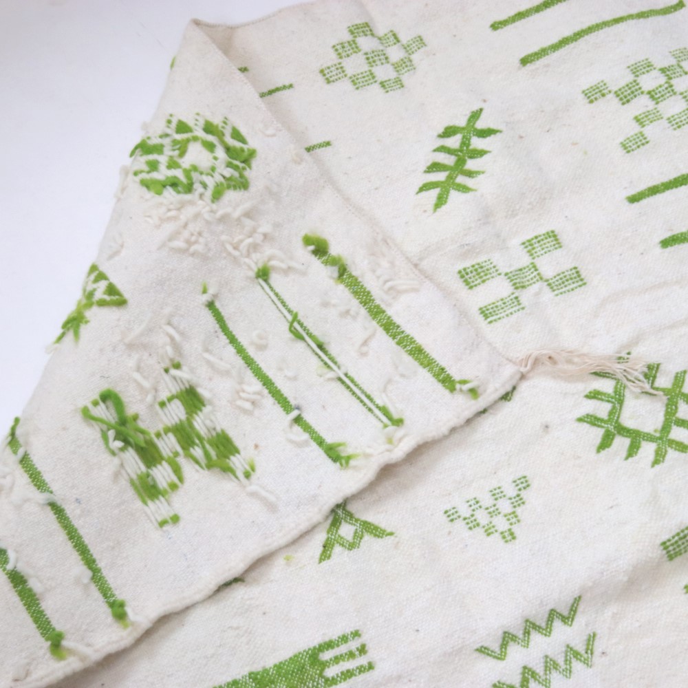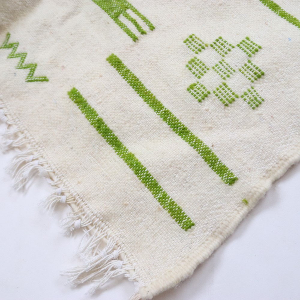 ワッザン地方で作られている絨毯、薄手タイプ一点物です。オフホワイトのベースに、オリーブグリーンで象徴的なモチーフを織り込んだ洗練されたデザイン。シンプルなデザインが魅力的です。薄手の羊毛ラグは、冬暖かく夏は素足に気持ちよく、オールシーズン活躍します。リビングやお部屋のポイントに、タペストリーとしても広くお使いいただけます。本物ならではの存在感をお楽しみください。