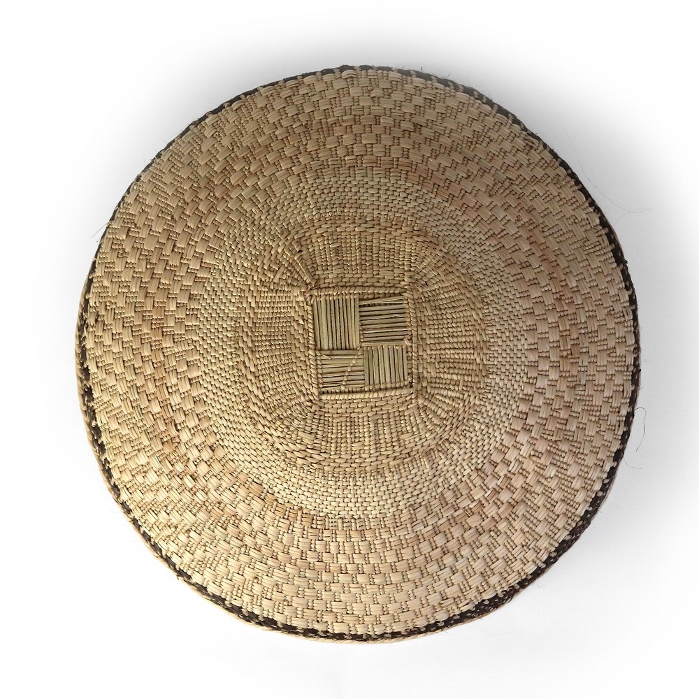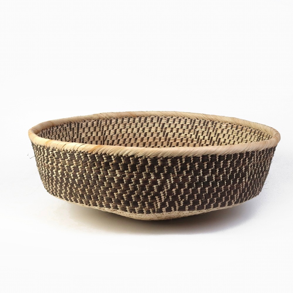 トンガバスケットは、ジンバブエ西部のビンガ地方で、 トンガ人の女性たちによってイララ(椰子の葉)を手編みして作られています。もとは穀物を運んだり選別するために使用されていました。 ストライプや蜘蛛の巣模様、稲妻模様などの伝統的なデザインと、四角い底の土台が特徴的。 放射状の葛に、ナチュラルなイララの葉と、樹皮や根、泥で染色を繰り返したブラウンの葉の二色が編み込まれ、二つとして同じ柄がないというの美しいカゴを創り出します。 また壺に似せたカラバッシュカゴをはじめ、様々なフォルムのカゴを器用に編み上げます。 これらは干ばつと貧困に見舞われやすい地域に住むトンガの人々にとって、貴重な現金収入となっています。 ひとつひとつ表情が異なるバスケットは、インテリアアイテムとして近年注目されています。