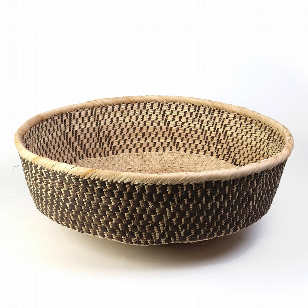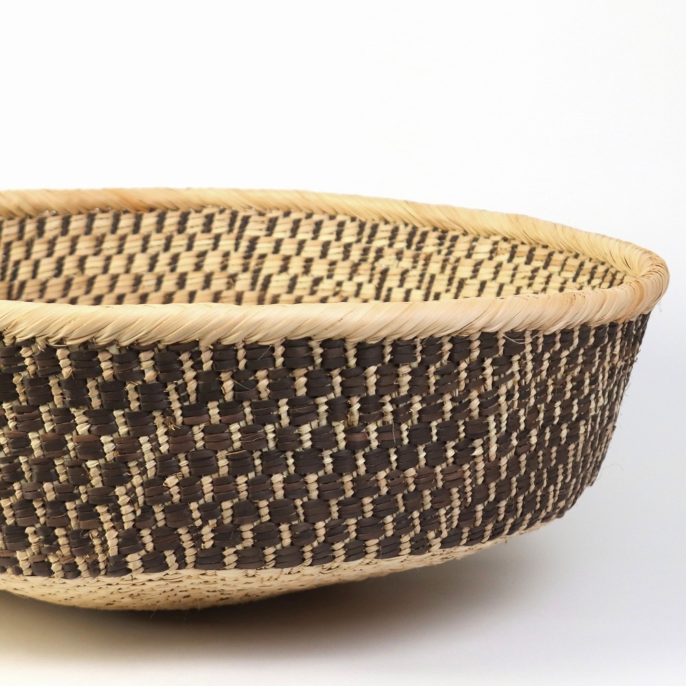 イララと呼ばれるパーム椰子を編み込んだボウルカゴです。フルーツや小物入れなどにおすすめ、存在感のあるかごです。ジンバブエのトンガ人の女性が一つ一つ編み上げる柄は実に多種多様、一つとして同じ柄が無いほどです。落ち着いた草木染のナチュラルカラーで、どんなインテリアにもマッチします。こちらは一点物です。
