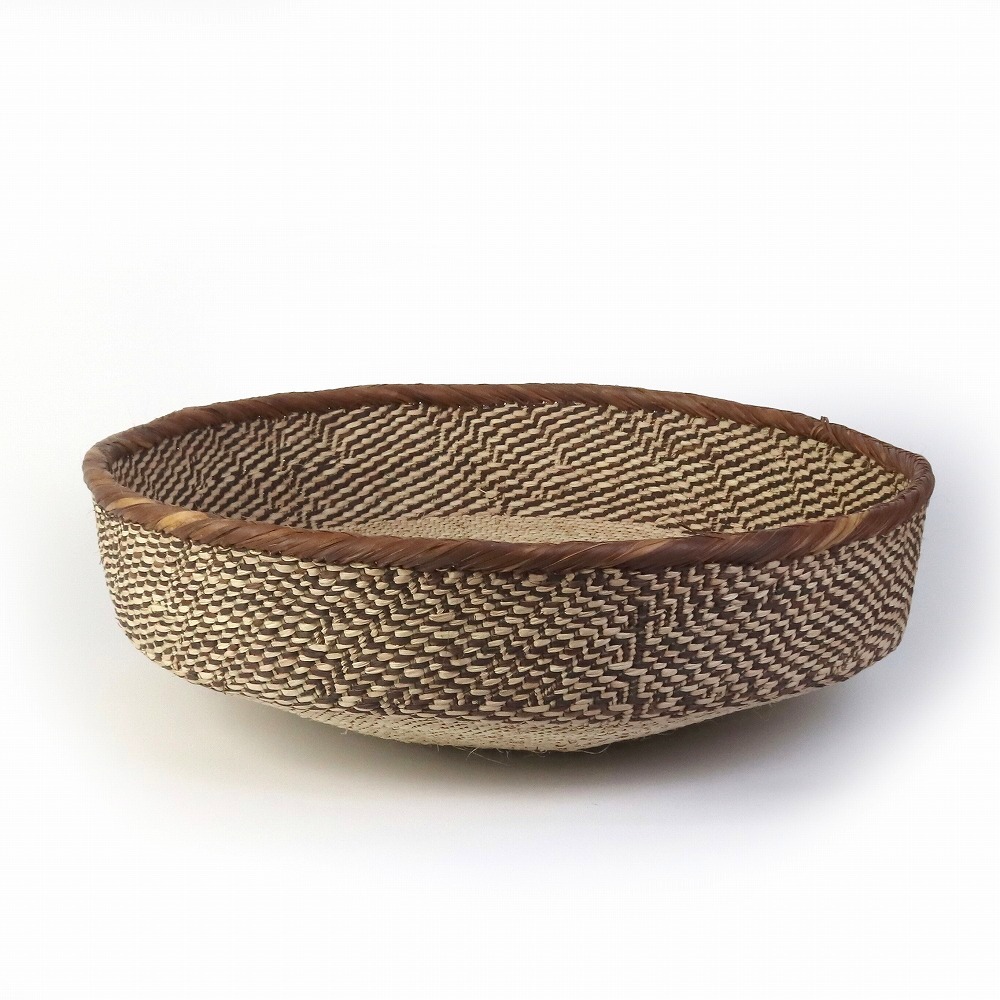 イララと呼ばれるパーム椰子を編み込んだボウルカゴです。フルーツや小物入れなどにおすすめ、存在感のあるかごです。ジンバブエのトンガ人の女性が一つ一つ編み上げる柄は実に多種多様、一つとして同じ柄が無いほどです。落ち着いた草木染のナチュラルカラーで、どんなインテリアにもマッチします。こちらは一点物です。