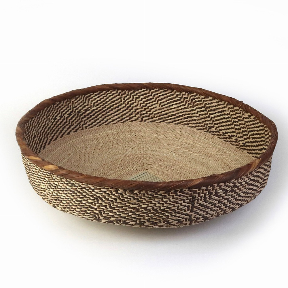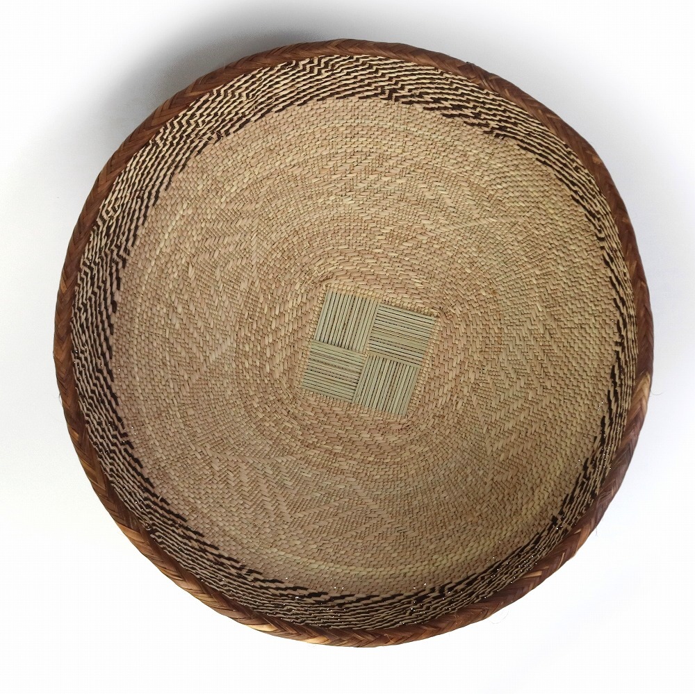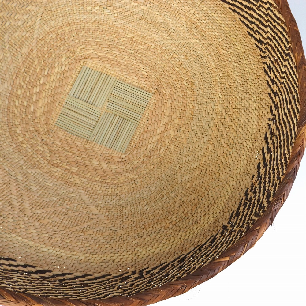 トンガバスケットは、ジンバブエ西部のビンガ地方で、 トンガ人の女性たちによってイララ(椰子の葉)を手編みして作られています。もとは穀物を運んだり選別するために使用されていました。 ストライプや蜘蛛の巣模様、稲妻模様などの伝統的なデザインと、四角い底の土台が特徴的。 放射状の葛に、ナチュラルなイララの葉と、樹皮や根、泥で染色を繰り返したブラウンの葉の二色が編み込まれ、二つとして同じ柄がないというの美しいカゴを創り出します。 また壺に似せたカラバッシュカゴをはじめ、様々なフォルムのカゴを器用に編み上げます。 これらは干ばつと貧困に見舞われやすい地域に住むトンガの人々にとって、貴重な現金収入となっています。 ひとつひとつ表情が異なるバスケットは、インテリアアイテムとして近年注目されています。
