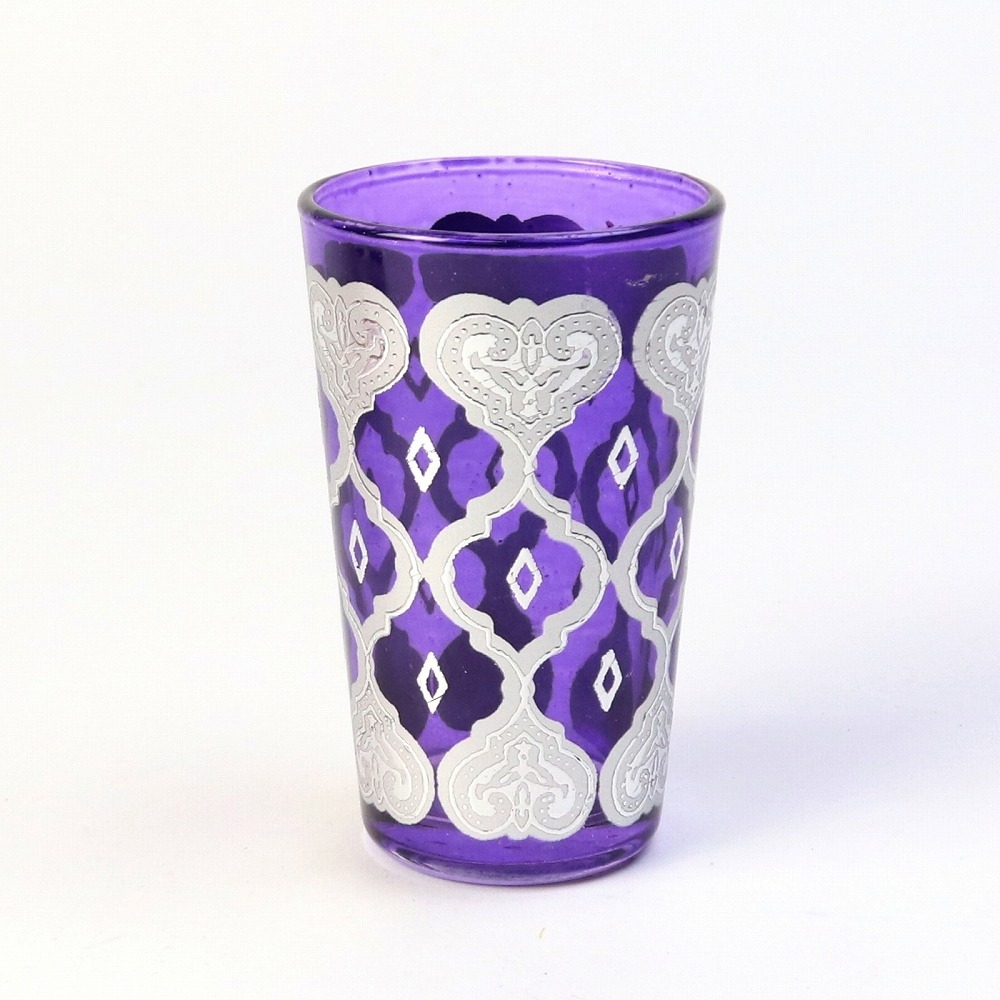 鮮やかな色彩とプリントがゴージャスなモロッコプリントグラスです。表面にエキゾチックな模様をプリントしたグラスは、現地ではミントティーグラスとして日常的に使われています。食品検査済
