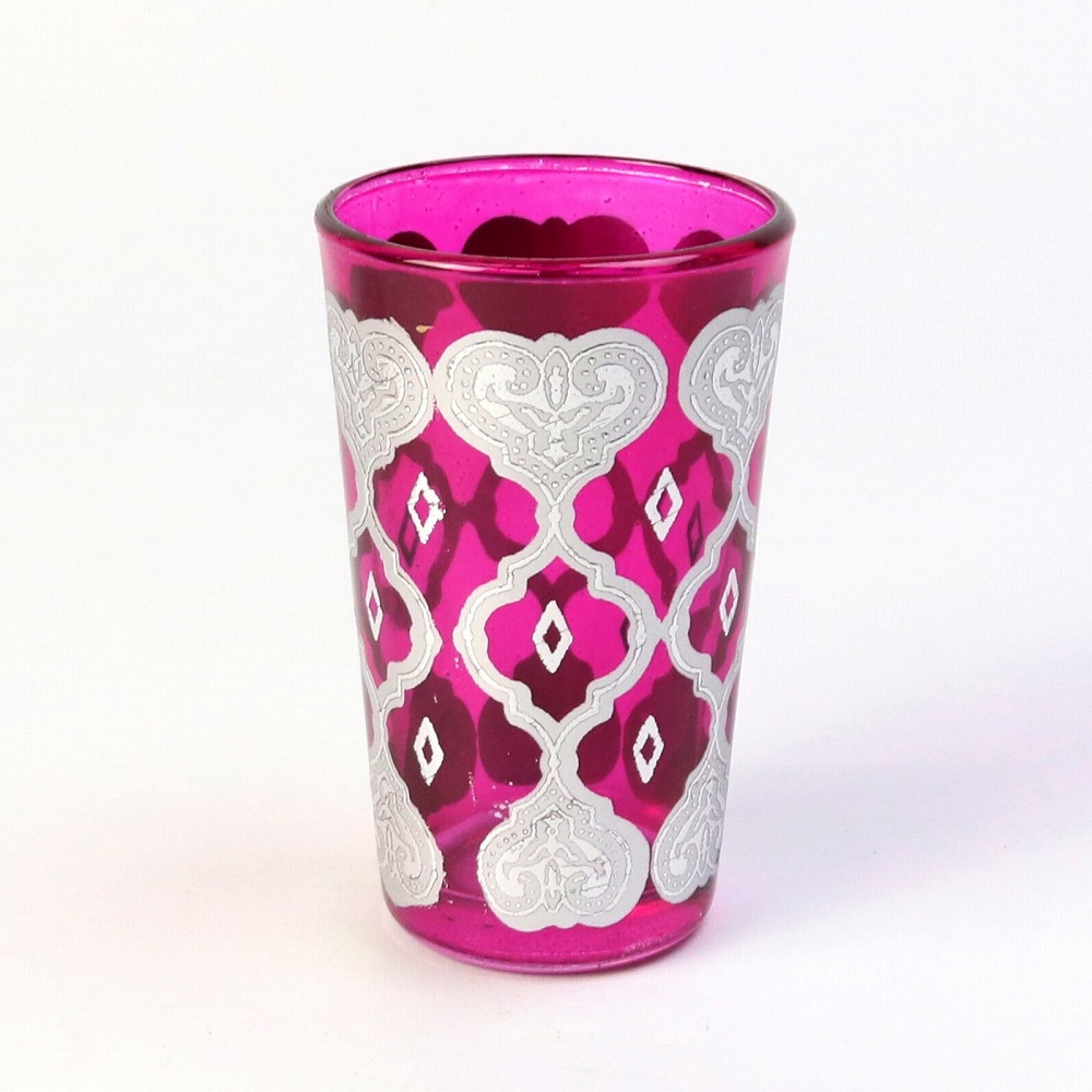 鮮やかな色彩とプリントがゴージャスなモロッコプリントグラスです。表面にエキゾチックな模様をプリントしたグラスは、現地ではミントティーグラスとして日常的に使われています。食品検査済