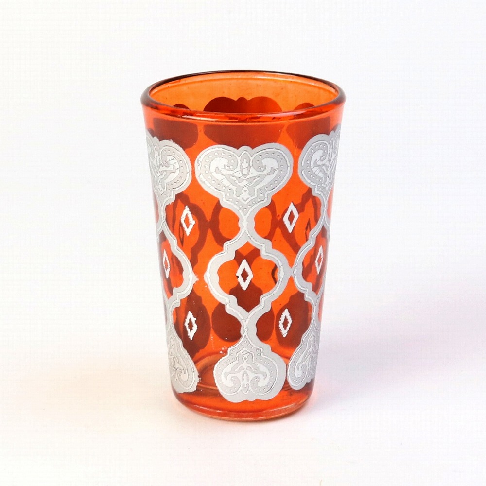 鮮やかな色彩とプリントがゴージャスなモロッコプリントグラスです。表面にエキゾチックな模様をプリントしたグラスは、現地ではミントティーグラスとして日常的に使われています。食品検査済