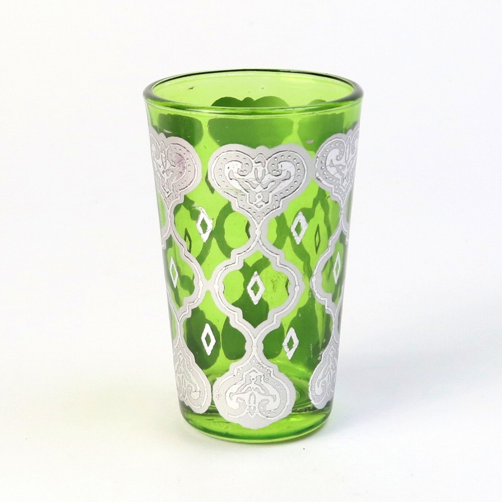 鮮やかな色彩とプリントがゴージャスなモロッコプリントグラスです。表面にエキゾチックな模様をプリントしたグラスは、現地ではミントティーグラスとして日常的に使われています。食品検査済