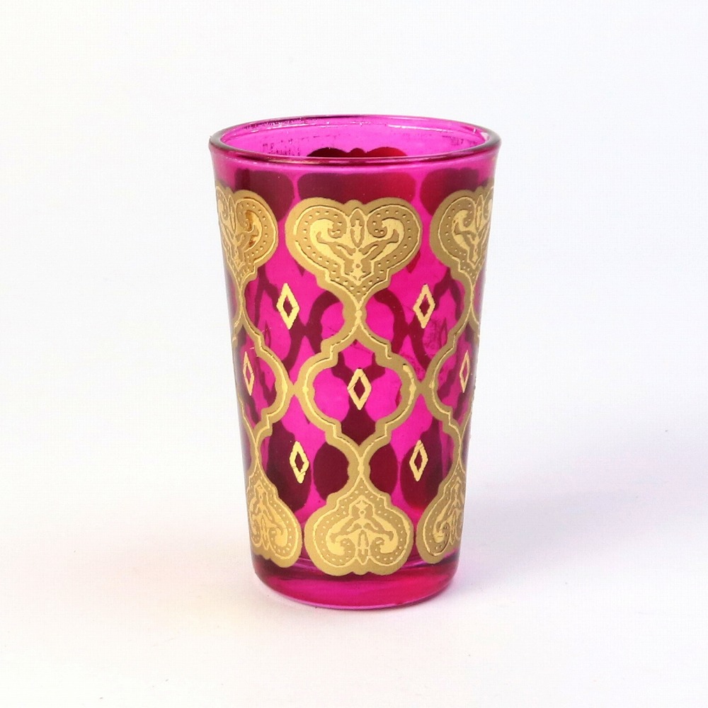 鮮やかな色彩とプリントがゴージャスなモロッコプリントグラスです。表面にエキゾチックな模様をプリントしたグラスは、現地ではミントティーグラスとして日常的に使われています。食品検査済