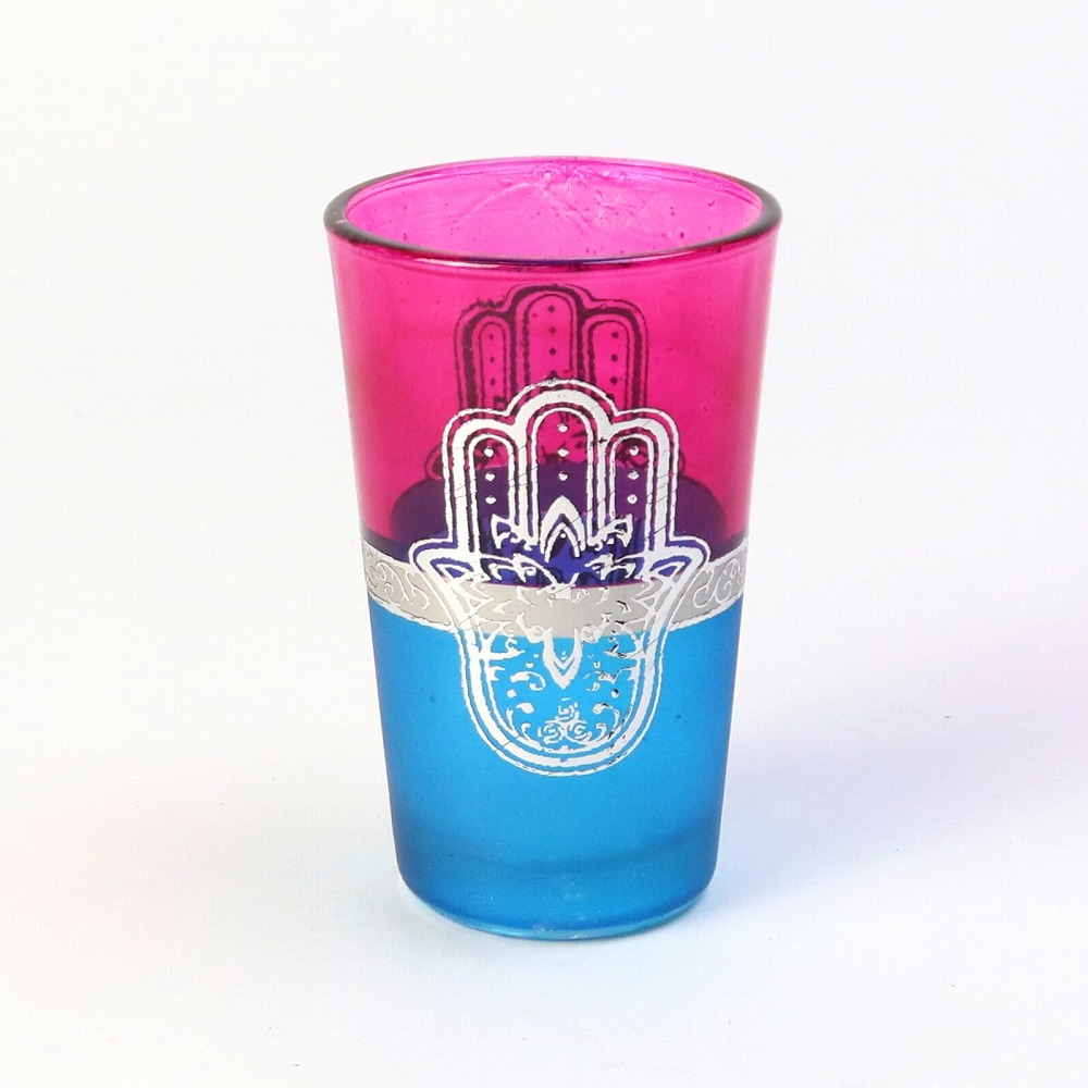 鮮やかな色彩とプリントがゴージャスなモロッコプリントグラスです。表面にエキゾチックな模様をプリントしたグラスは、現地ではミントティーグラスとして日常的に使われています。食品検査済