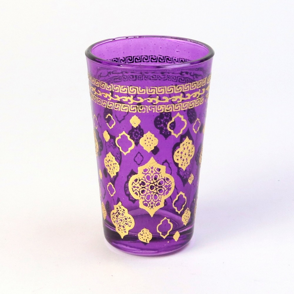 鮮やかな色彩とプリントがゴージャスなモロッコプリントグラスです。表面にエキゾチックな模様をプリントしたグラスは、現地ではミントティーグラスとして日常的に使われています。食品検査済
