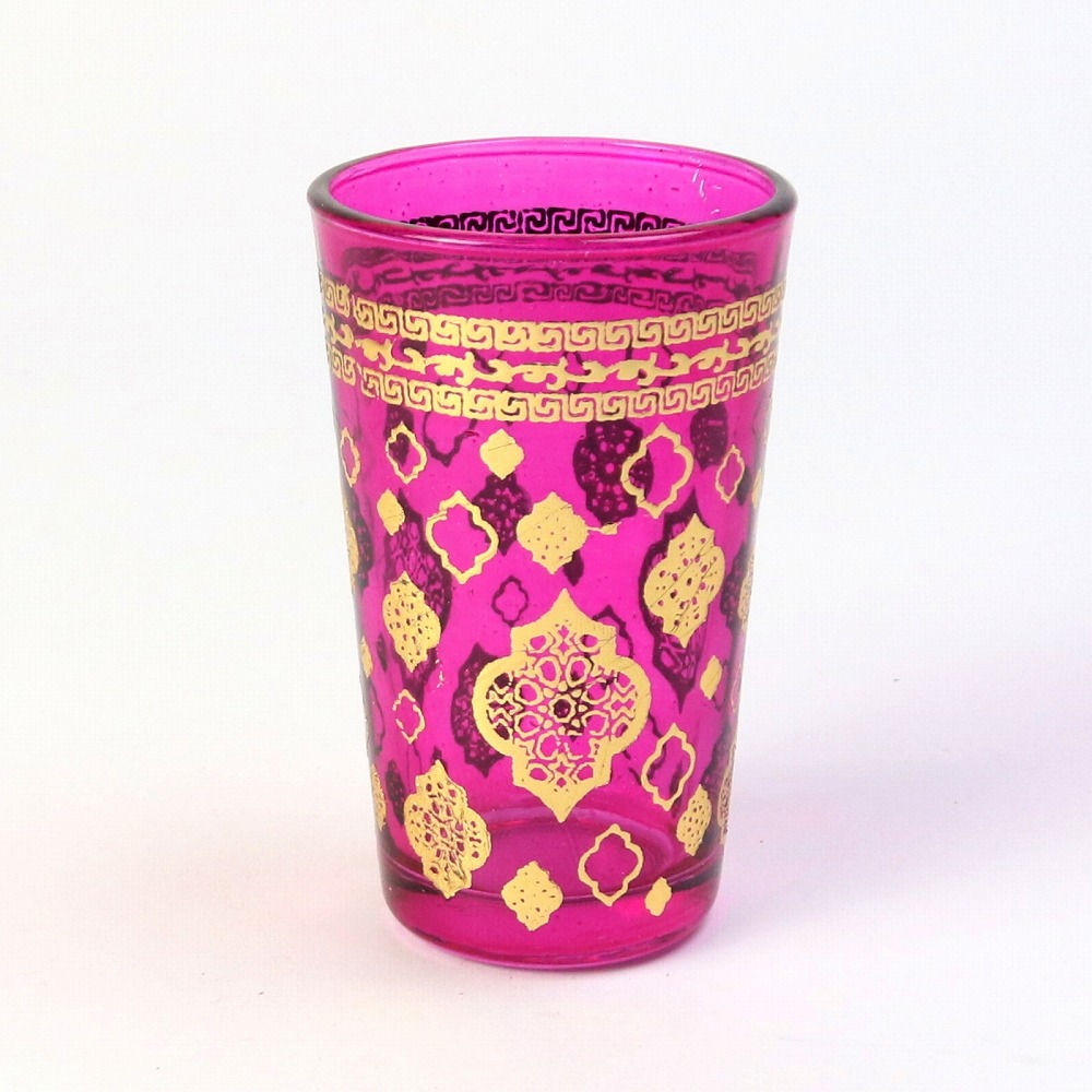 鮮やかな色彩とプリントがゴージャスなモロッコプリントグラスです。表面にエキゾチックな模様をプリントしたグラスは、現地ではミントティーグラスとして日常的に使われています。食品検査済
