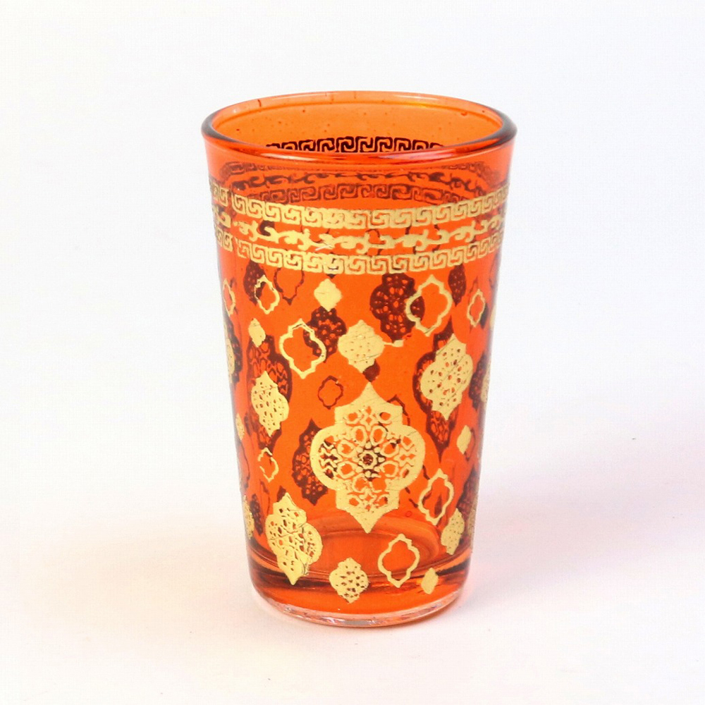 鮮やかな色彩とプリントがゴージャスなモロッコプリントグラスです。表面にエキゾチックな模様をプリントしたグラスは、現地ではミントティーグラスとして日常的に使われています。食品検査済