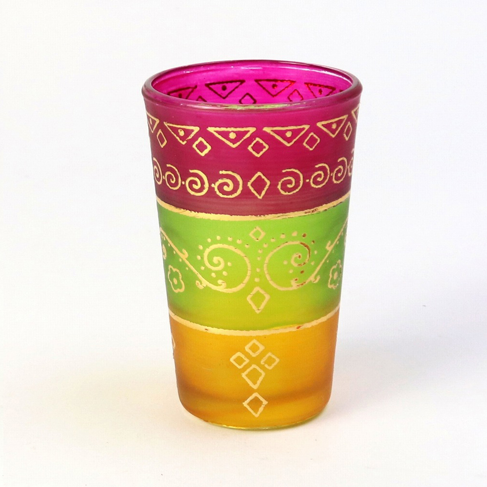 鮮やかな色彩とプリントがゴージャスなモロッコプリントグラスです。表面にエキゾチックな模様をプリントしたグラスは、現地ではミントティーグラスとして日常的に使われています。食品検査済