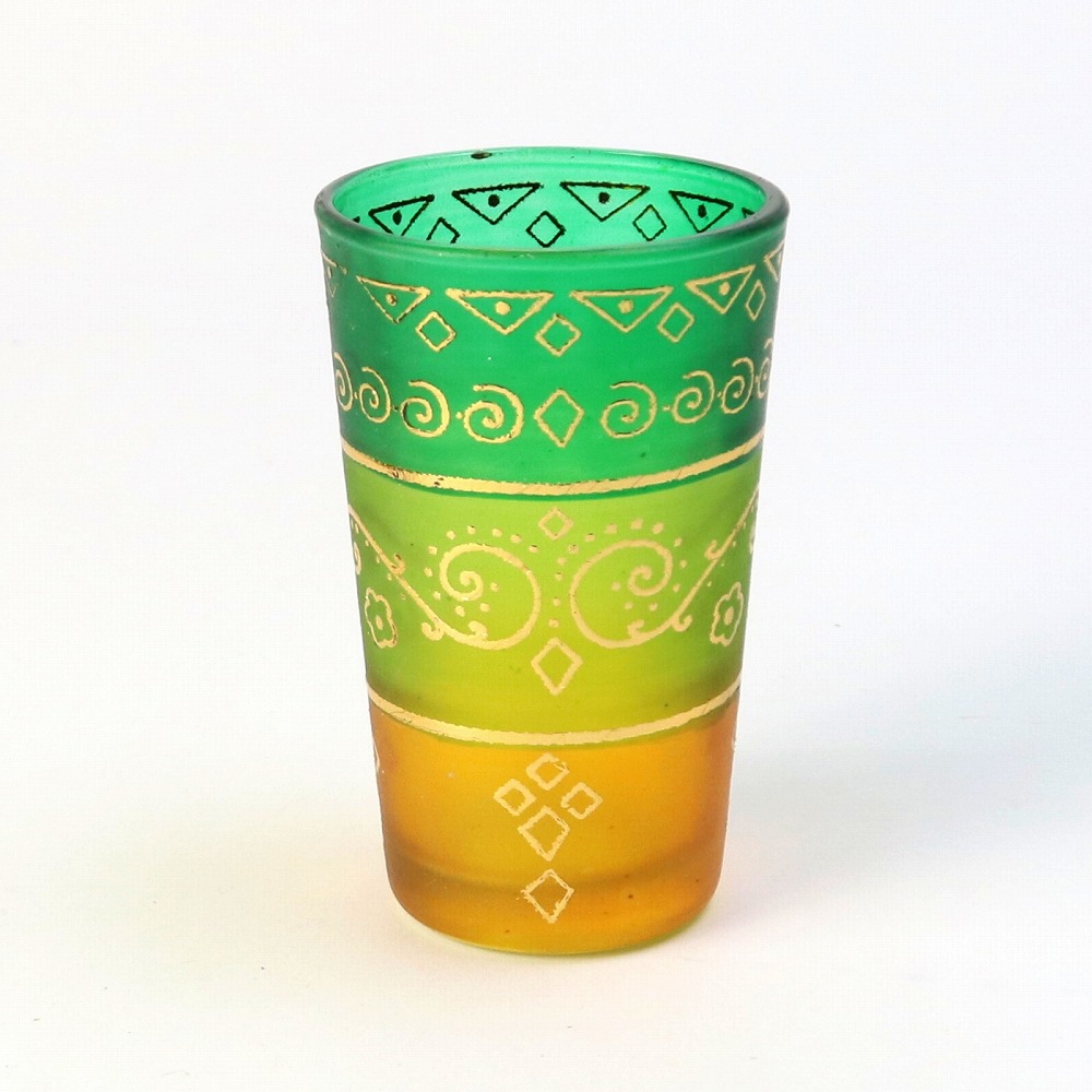 鮮やかな色彩とプリントがゴージャスなモロッコプリントグラスです。表面にエキゾチックな模様をプリントしたグラスは、現地ではミントティーグラスとして日常的に使われています。食品検査済
