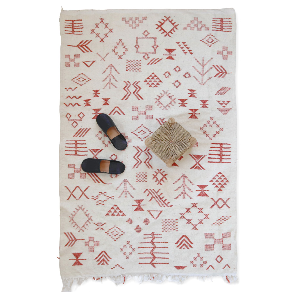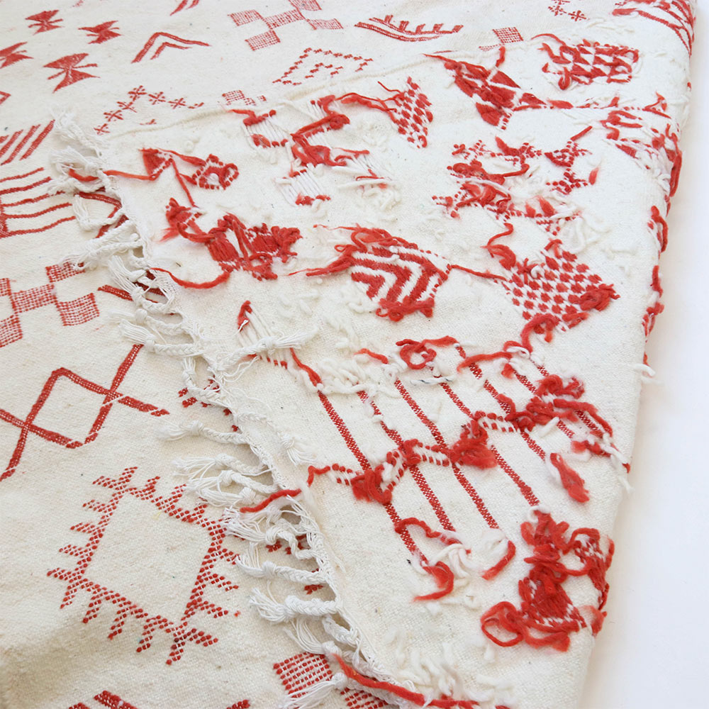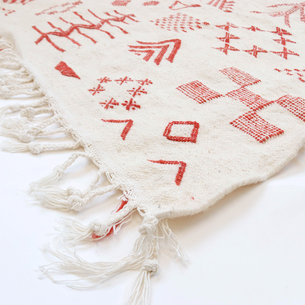 ワッザン地方で作られている絨毯、薄手タイプ一点物です。オフホワイトのベースに、黒糸で象徴的なモチーフを織り込んだ洗練されたデザイン。モノトーンのシンプルなデザインが魅力的です。薄手の羊毛ラグは、冬暖かく夏は素足に気持ちよく、オールシーズン活躍します。リビングやお部屋のポイントに、タペストリーとしても広くお使いいただけます。本物ならではの存在感をお楽しみください。