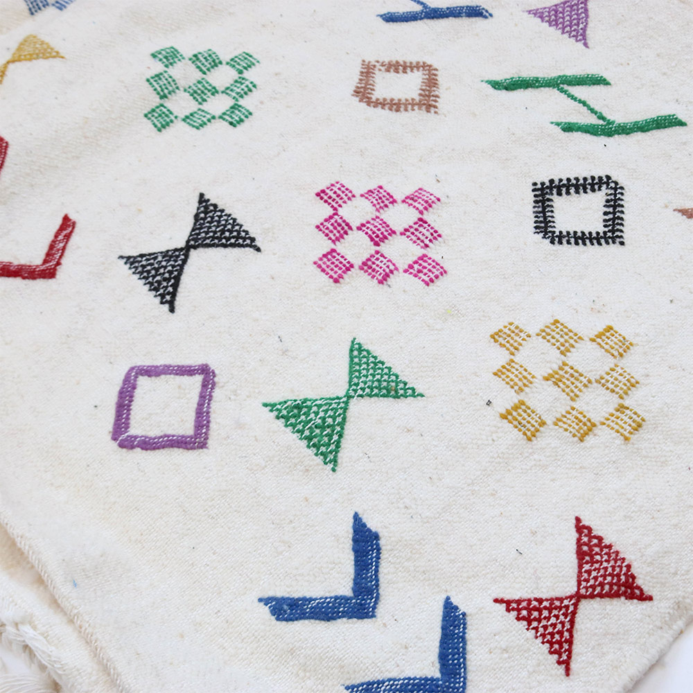 チュニジアのキリムは、縦糸にコットン糸を使用し、ダイヤ形のモチーフRegma(複数形regam)と呼ばれ柄で繰り返し織り込まれます。