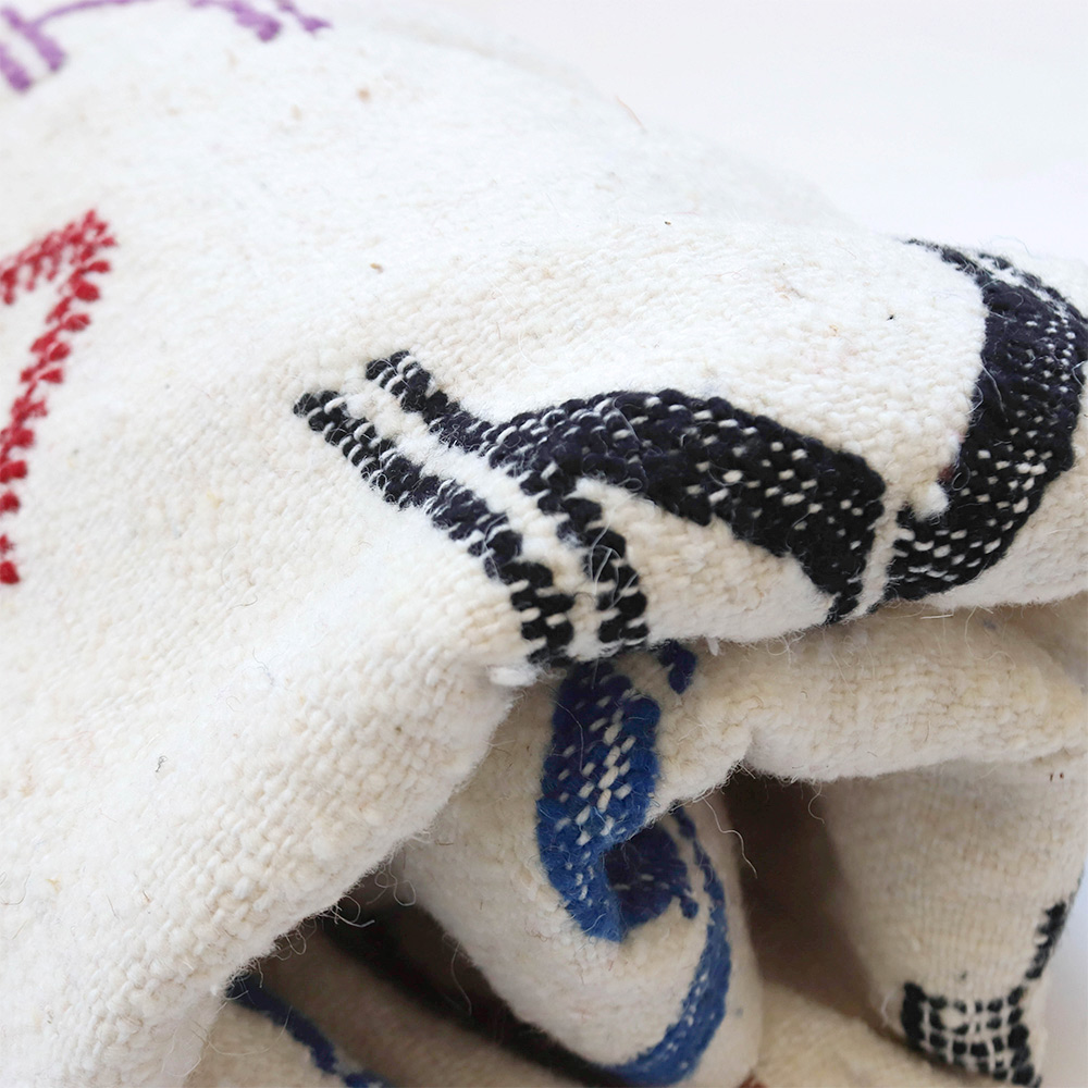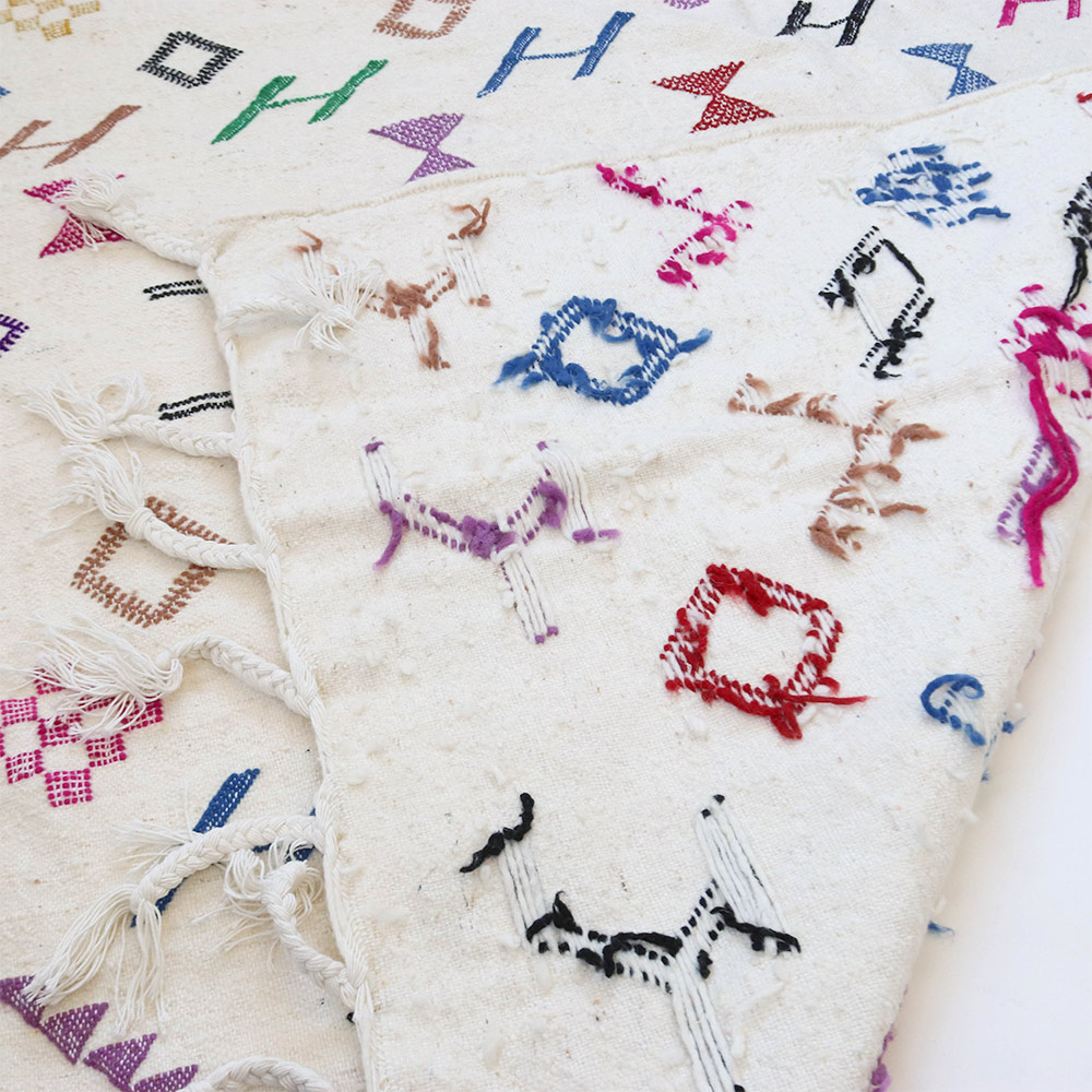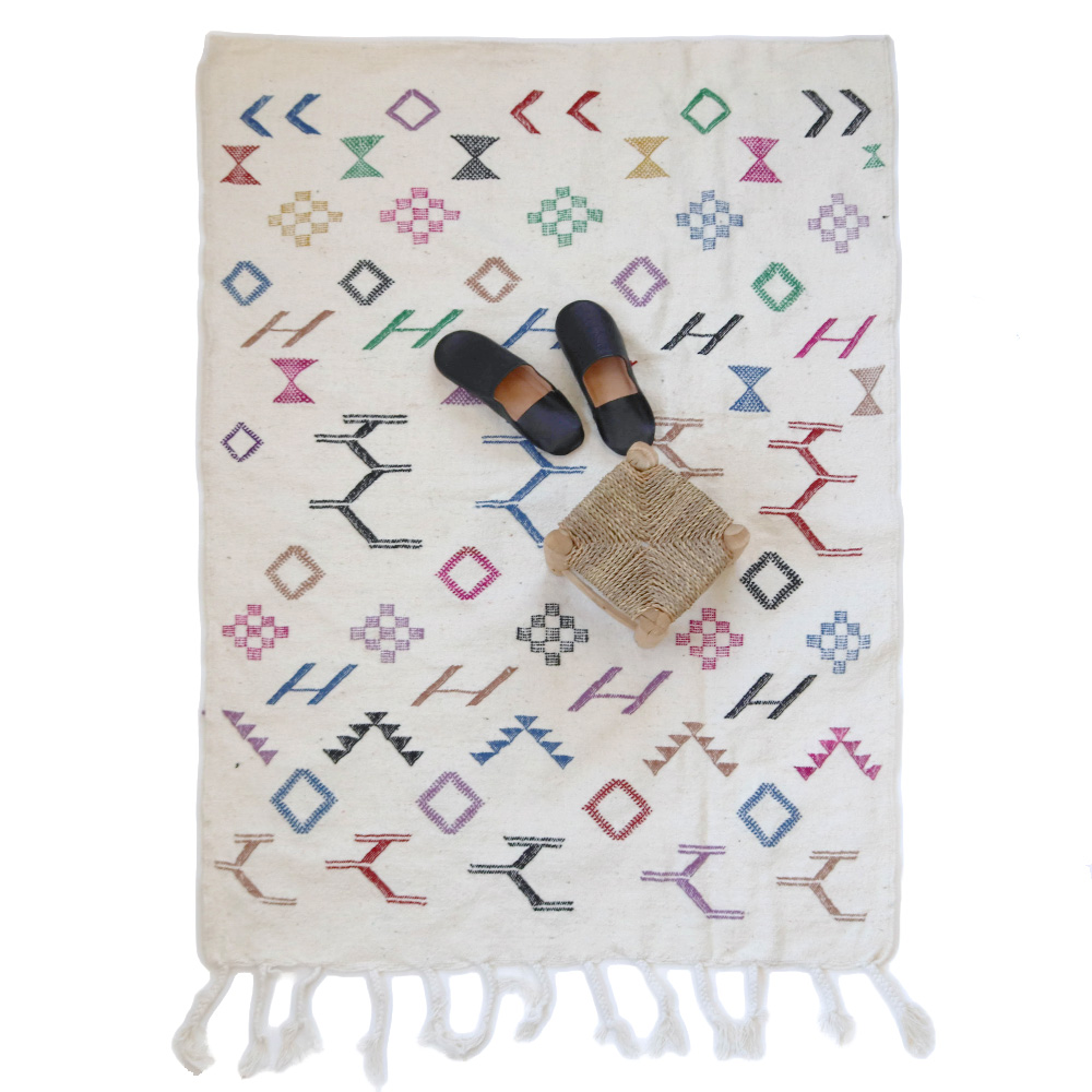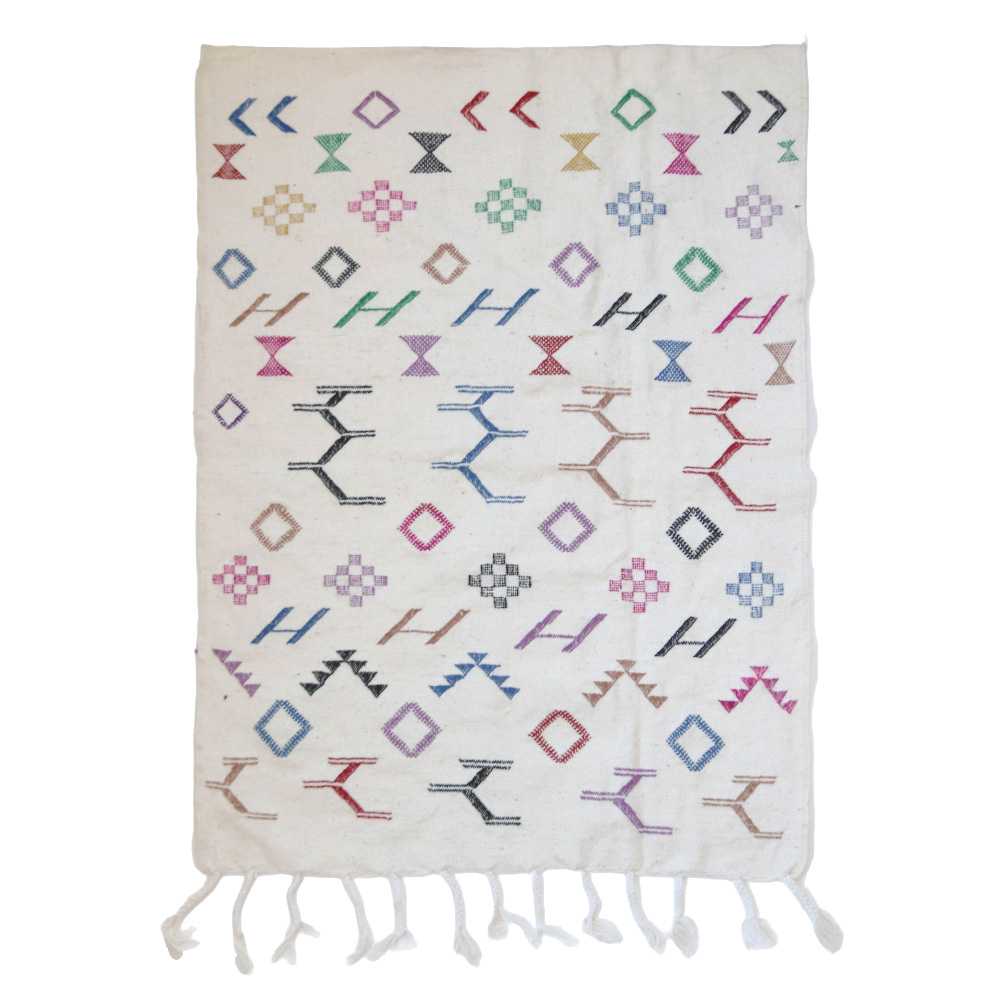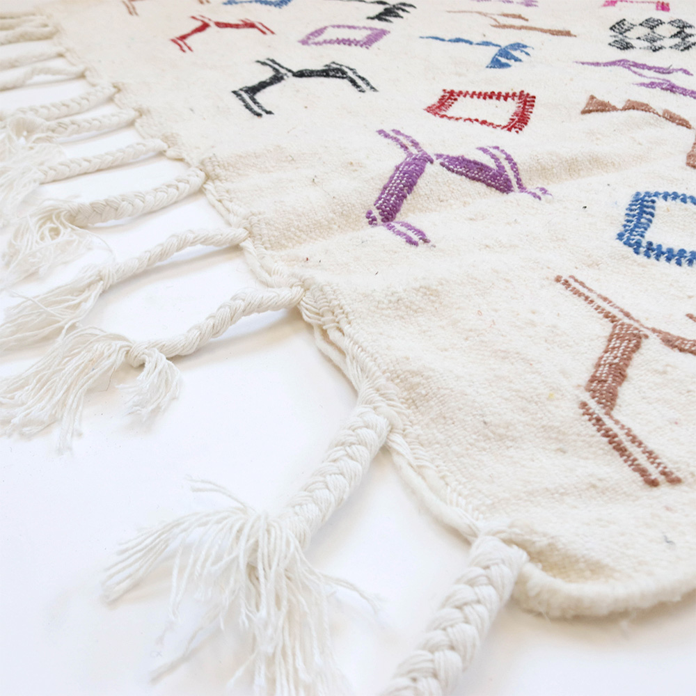ワッザン地方で作られている絨毯、薄手タイプ一点物です。オフホワイトのベースに、黒糸で象徴的なモチーフを織り込んだ洗練されたデザイン。モノトーンのシンプルなデザインが魅力的です。薄手の羊毛ラグは、冬暖かく夏は素足に気持ちよく、オールシーズン活躍します。リビングやお部屋のポイントに、タペストリーとしても広くお使いいただけます。本物ならではの存在感をお楽しみください。