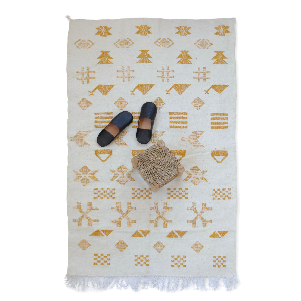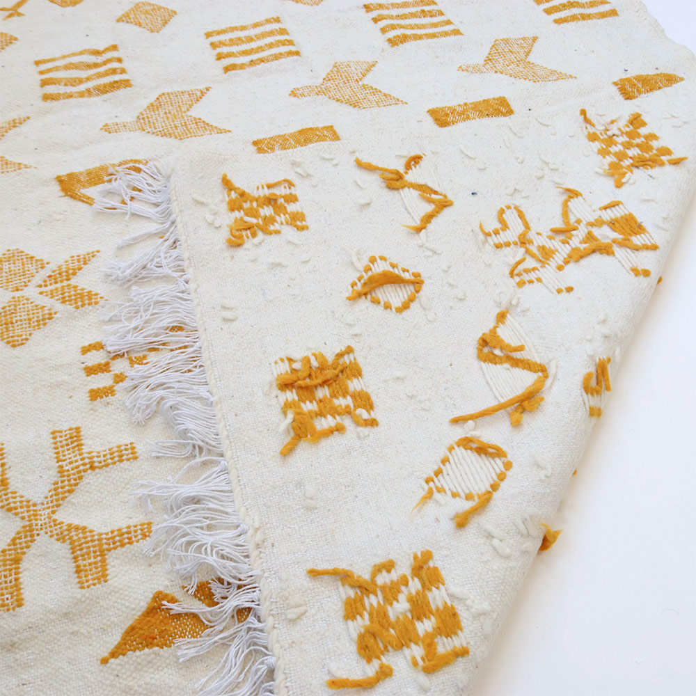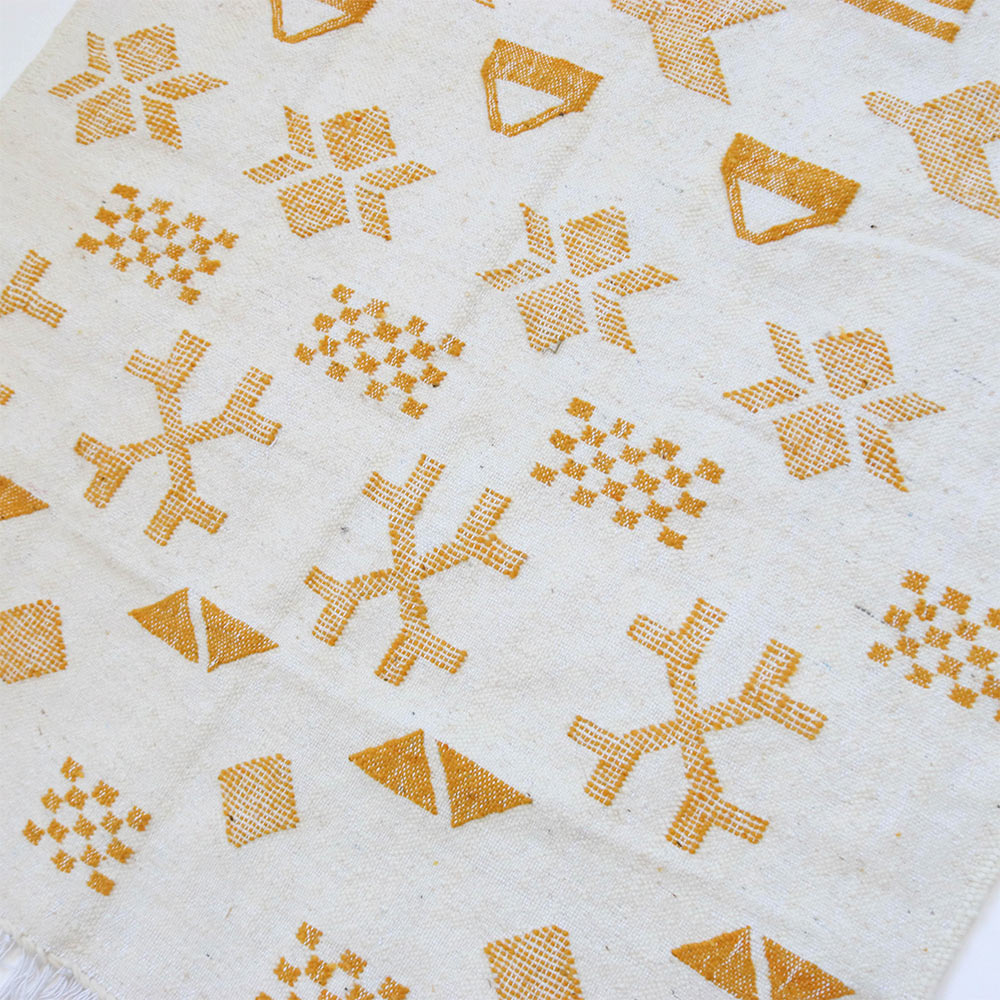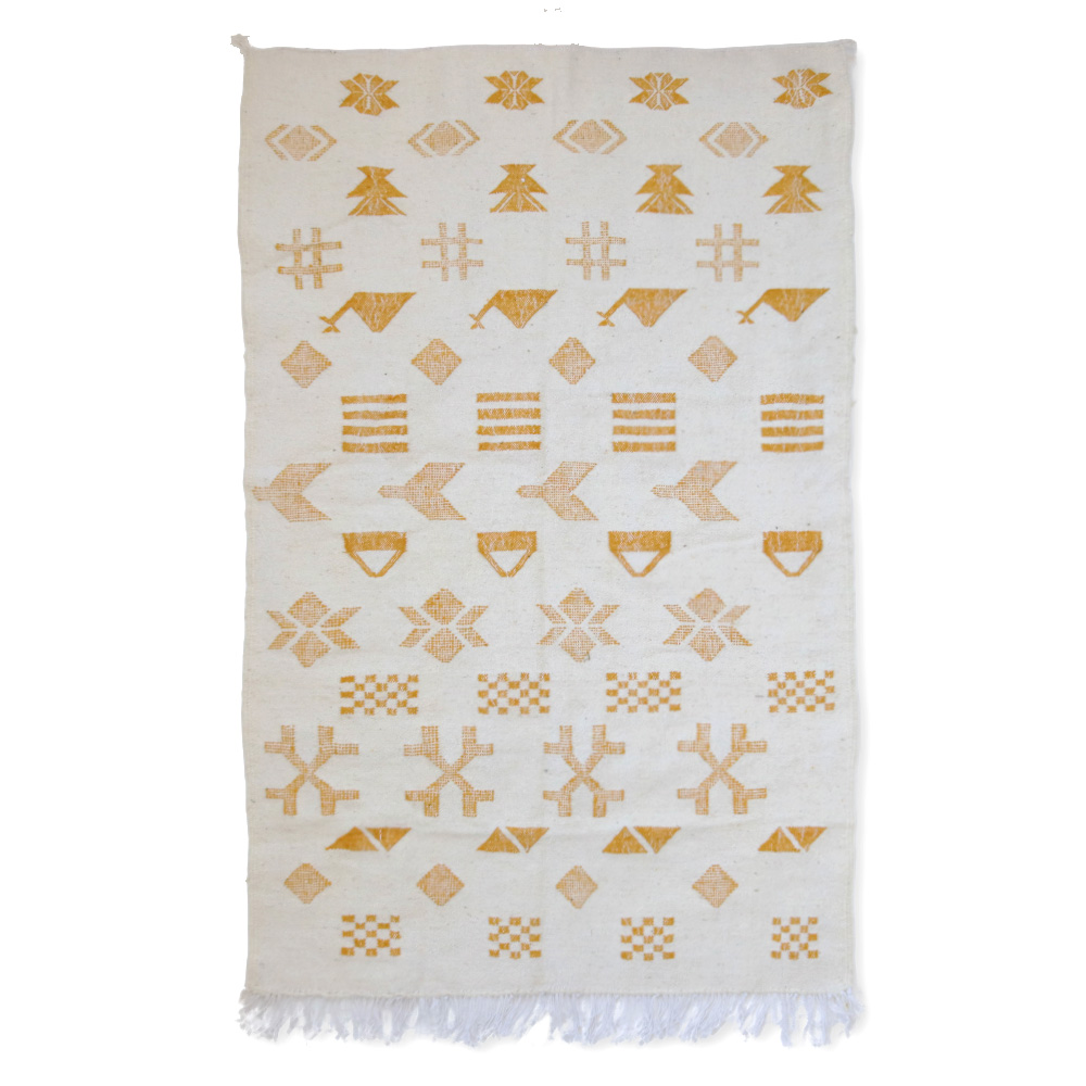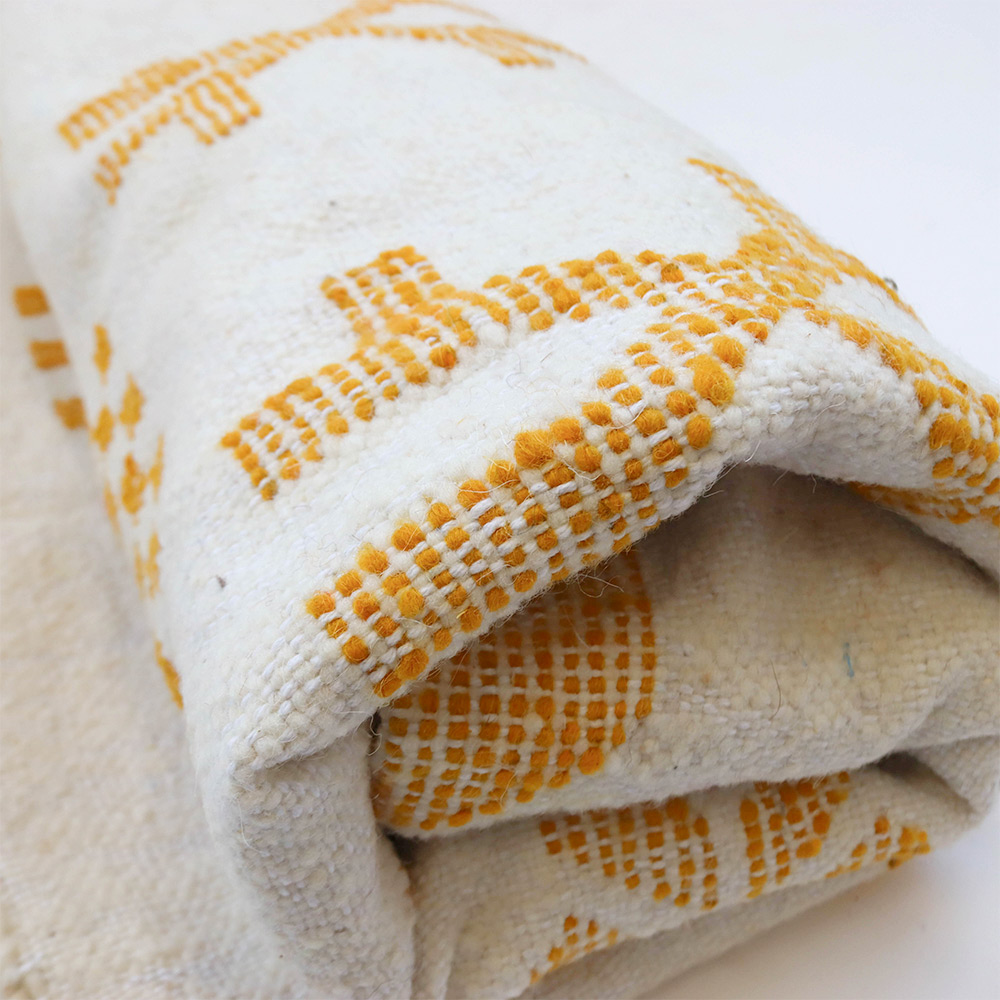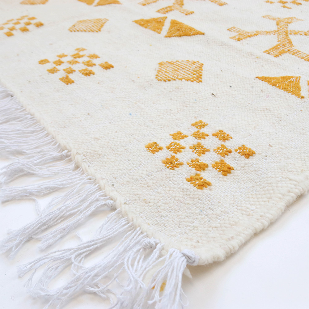 ワッザン地方で作られている絨毯、薄手タイプ一点物です。オフホワイトのベースに、黒糸で象徴的なモチーフを織り込んだ洗練されたデザイン。モノトーンのシンプルなデザインが魅力的です。薄手の羊毛ラグは、冬暖かく夏は素足に気持ちよく、オールシーズン活躍します。リビングやお部屋のポイントに、タペストリーとしても広くお使いいただけます。本物ならではの存在感をお楽しみください。
