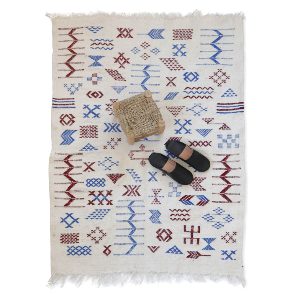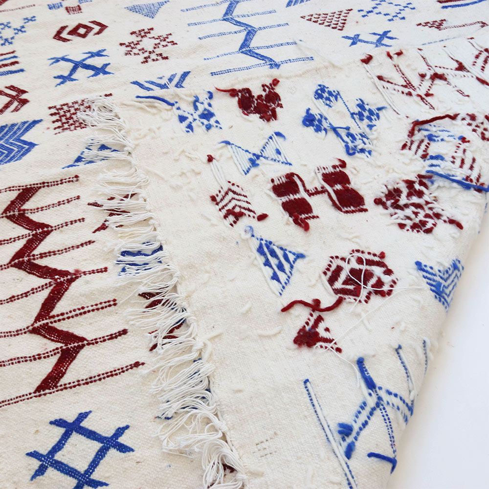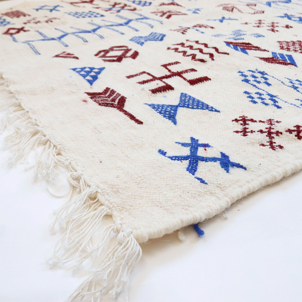 ワッザン地方で作られている絨毯、薄手タイプ一点物です。オフホワイトのベースに、黒糸で象徴的なモチーフを織り込んだ洗練されたデザイン。モノトーンのシンプルなデザインが魅力的です。薄手の羊毛ラグは、冬暖かく夏は素足に気持ちよく、オールシーズン活躍します。リビングやお部屋のポイントに、タペストリーとしても広くお使いいただけます。本物ならではの存在感をお楽しみください。