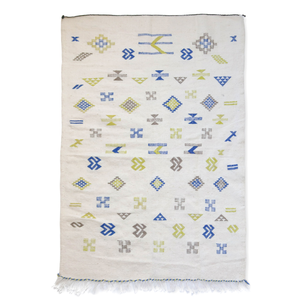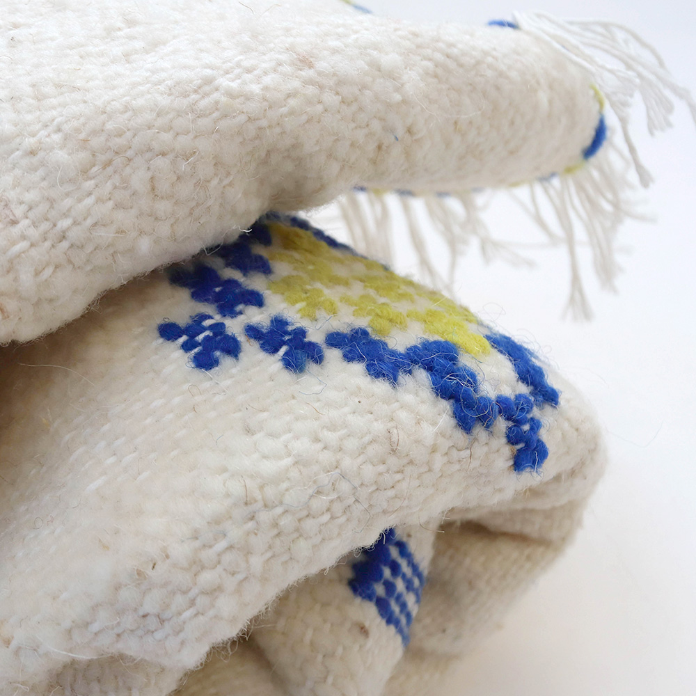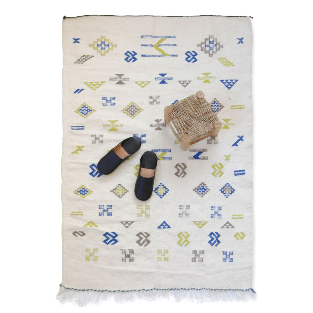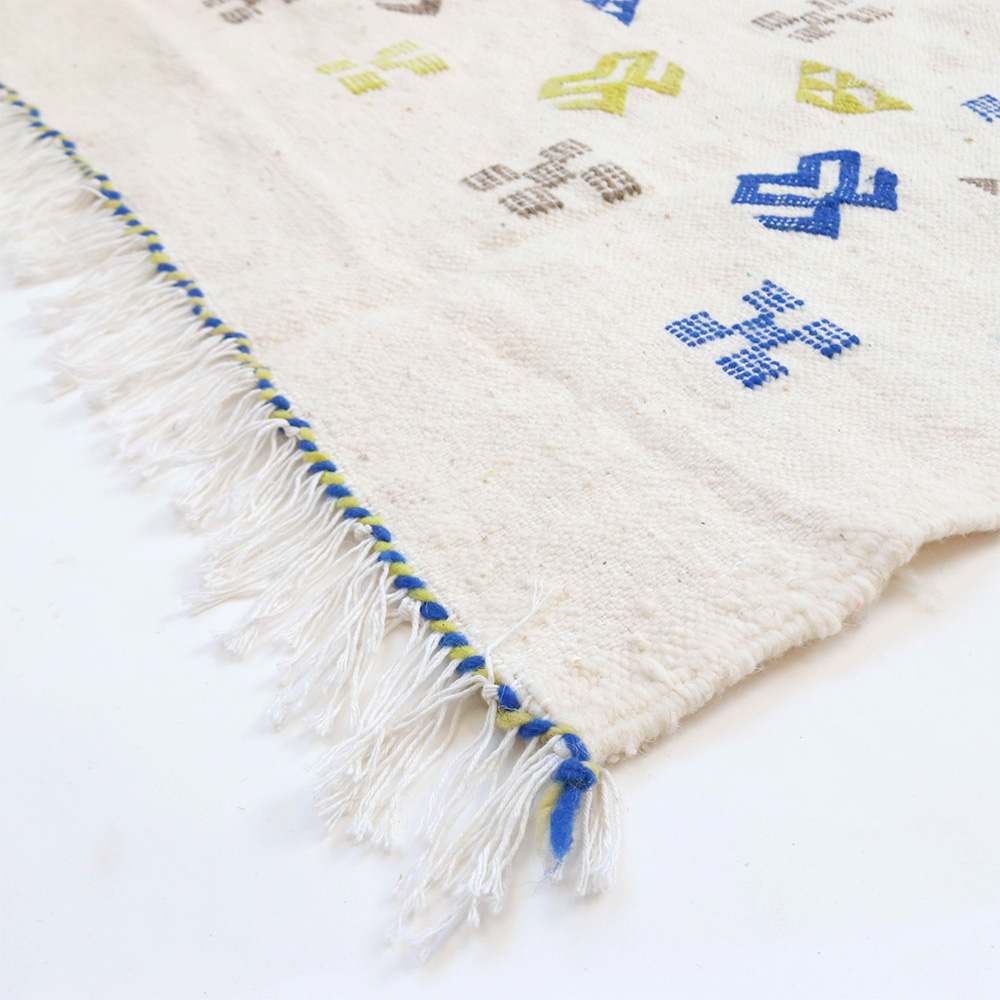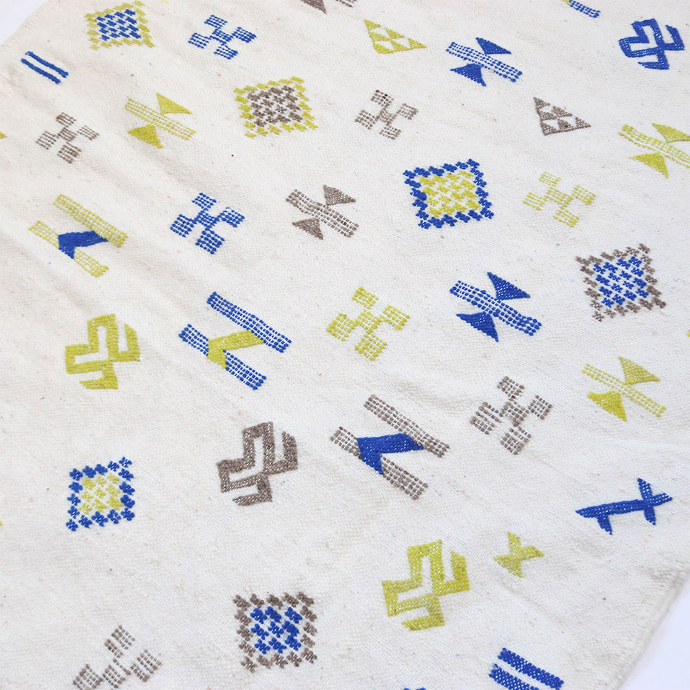 ワッザン地方で作られている絨毯、薄手タイプ一点物です。オフホワイトのベースに、黒糸で象徴的なモチーフを織り込んだ洗練されたデザイン。モノトーンのシンプルなデザインが魅力的です。薄手の羊毛ラグは、冬暖かく夏は素足に気持ちよく、オールシーズン活躍します。リビングやお部屋のポイントに、タペストリーとしても広くお使いいただけます。本物ならではの存在感をお楽しみください。