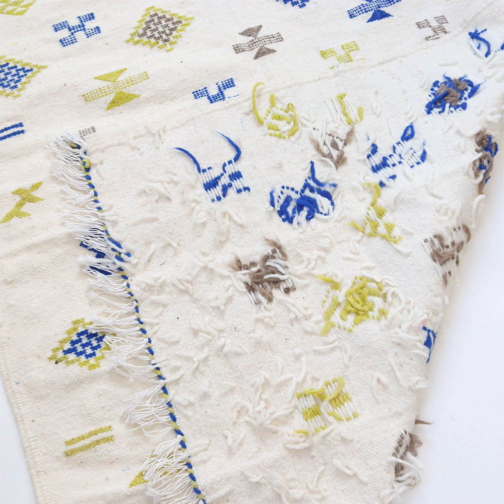 チュニジアのキリムは、縦糸にコットン糸を使用し、ダイヤ形のモチーフRegma(複数形regam)と呼ばれ柄で繰り返し織り込まれます。