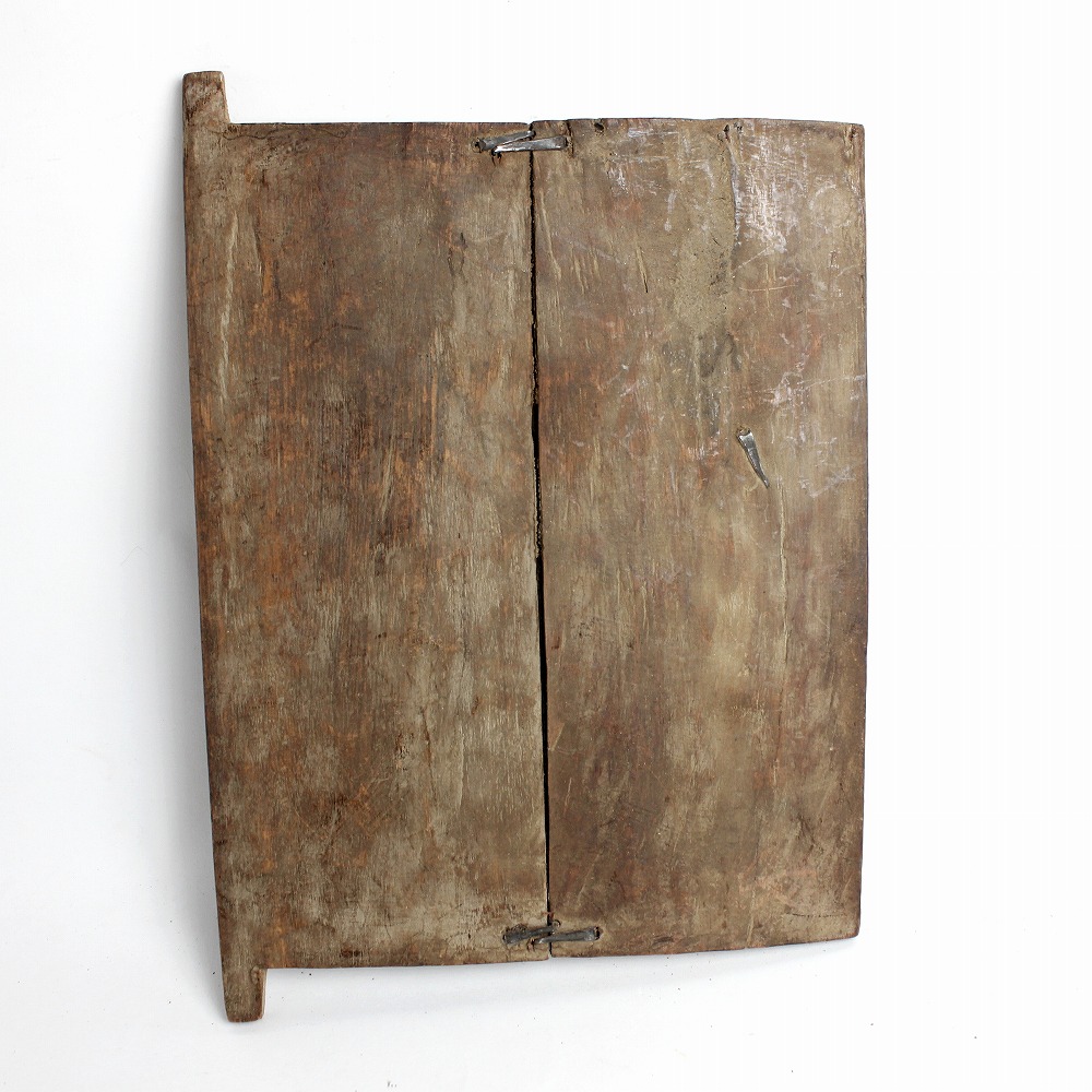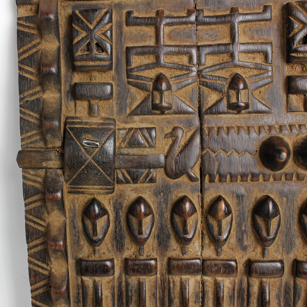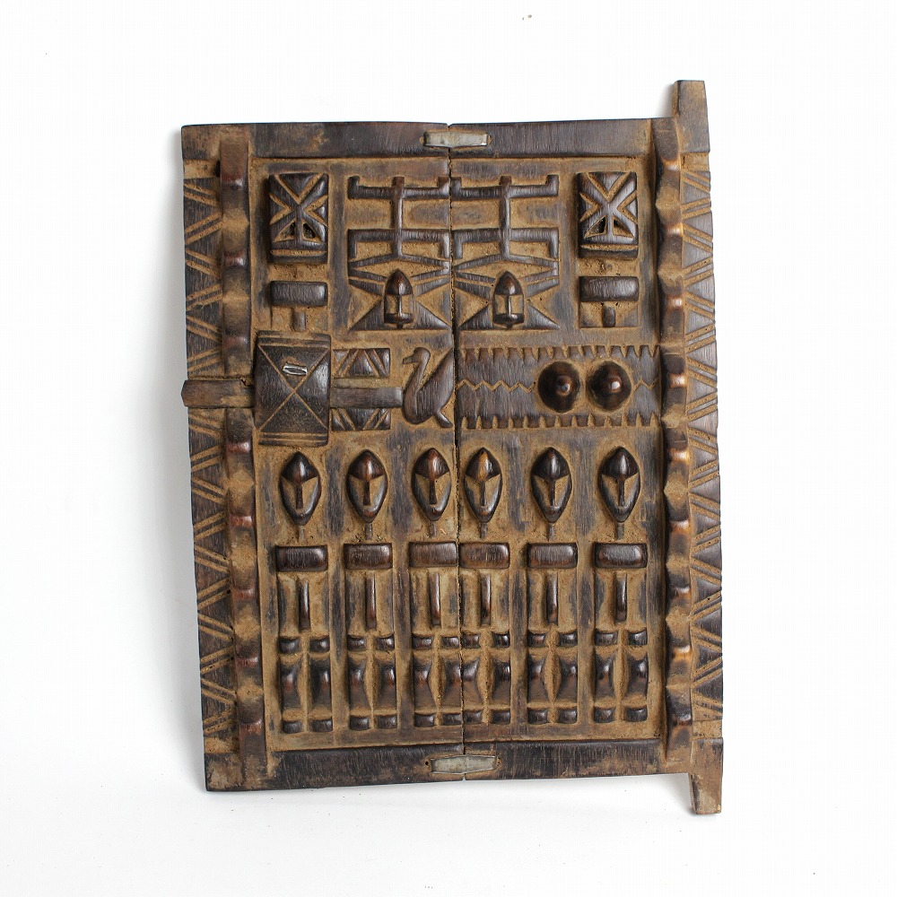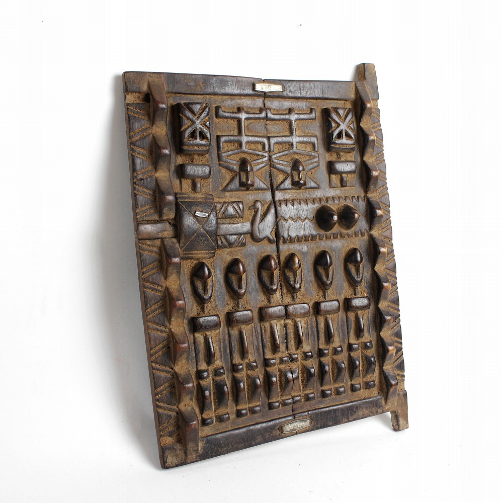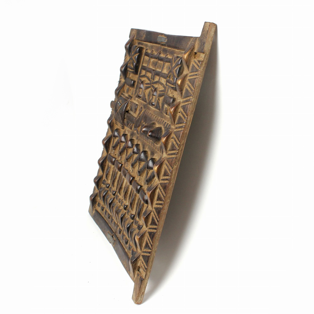 ドゴンの人々が穀物倉庫に使用するの木窓のレプリカです。神話に登場する動物や祖先を表す人物など様々なデザインが手彫りされており、これらには貴重な食料を守るための祈りが込められています。