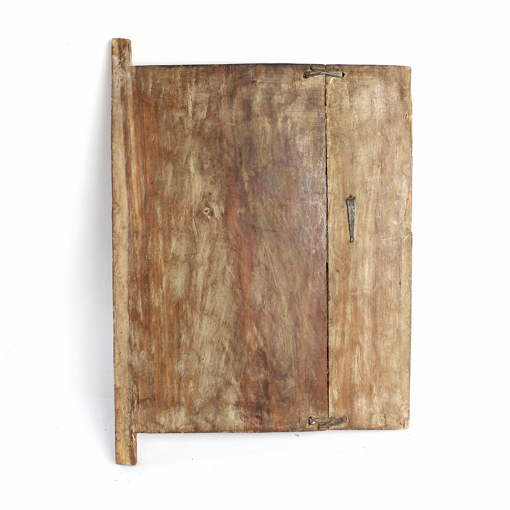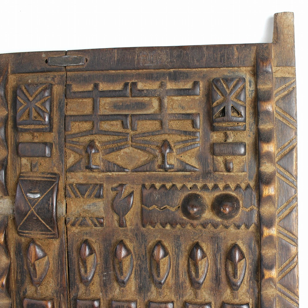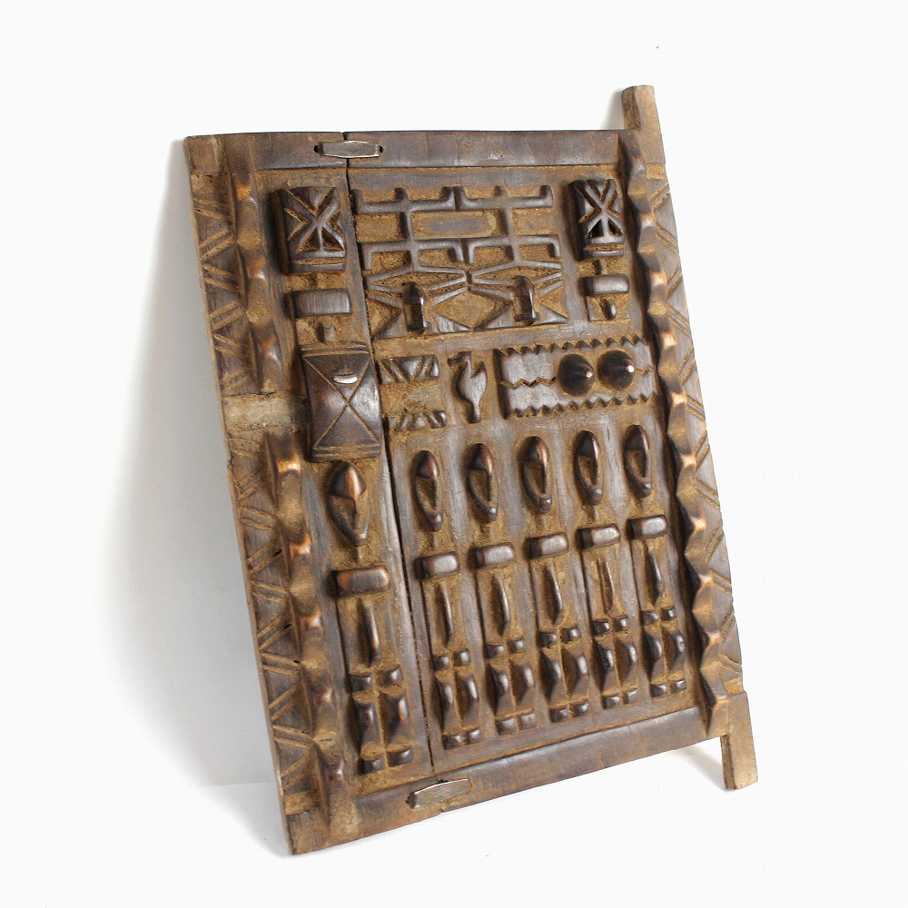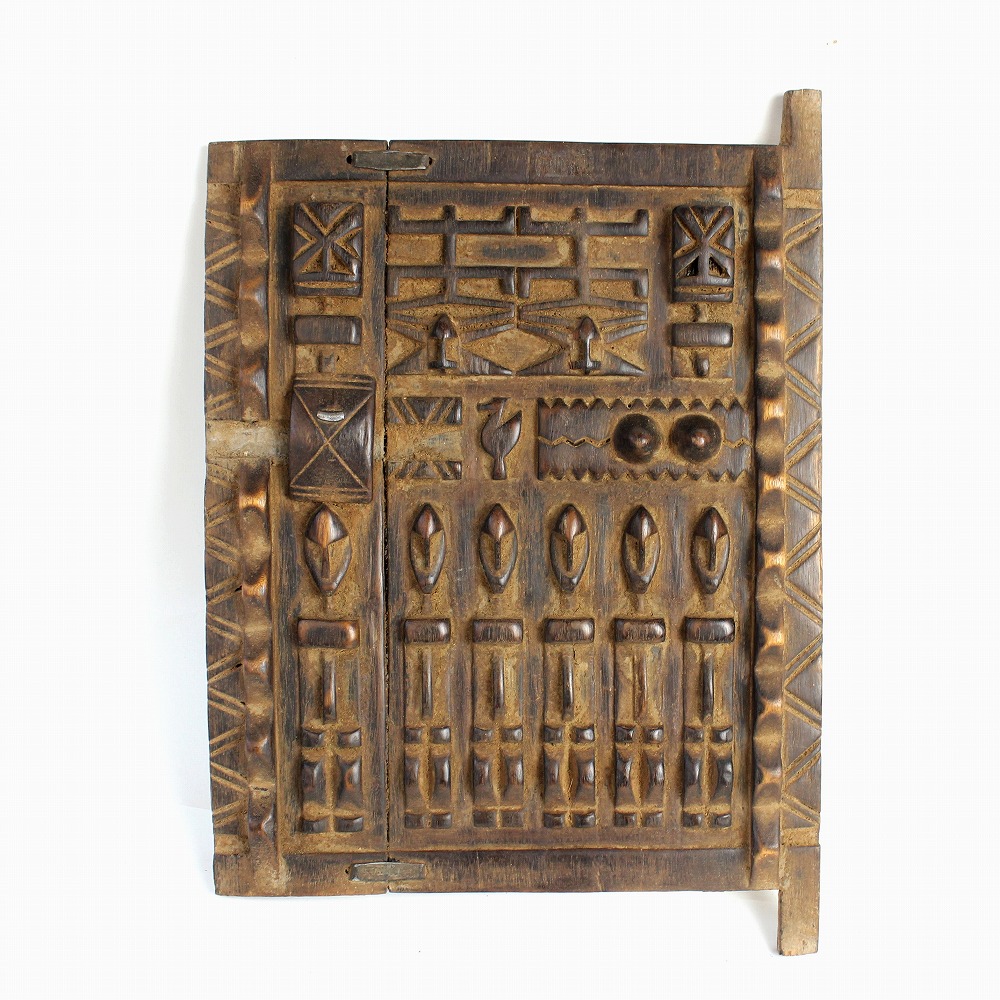 ドゴンの人々が穀物倉庫に使用するの木窓のレプリカです。神話に登場する動物や祖先を表す人物など様々なデザインが手彫りされており、これらには貴重な食料を守るための祈りが込められています。