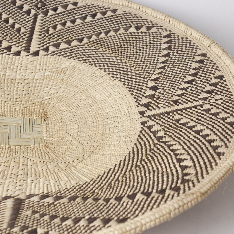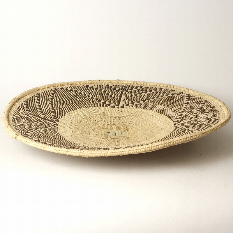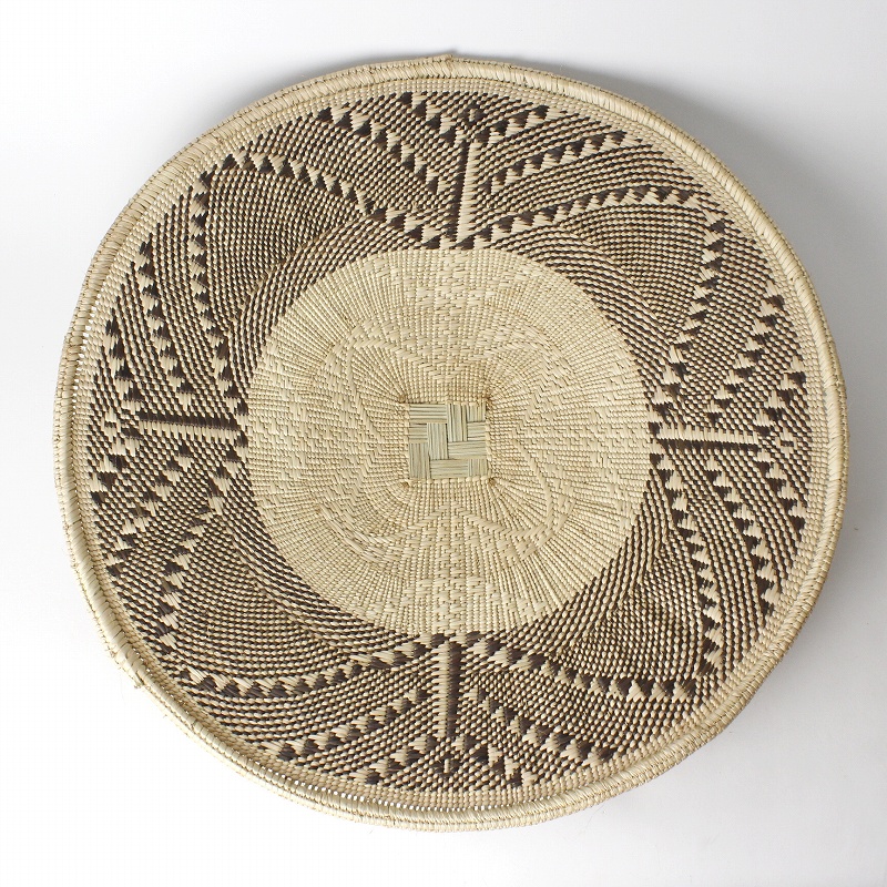 トンガバスケットは、ジンバブエ西部のビンガ地方で、 トンガ人の女性たちによってイララ(椰子の葉)を手編みして作られています。もとは穀物を運んだり選別するために使用されていました。 ストライプや蜘蛛の巣模様、稲妻模様などの伝統的なデザインと、四角い底の土台が特徴的。 放射状の葛に、ナチュラルなイララの葉と、樹皮や根、泥で染色を繰り返したブラウンの葉の二色が編み込まれ、二つとして同じ柄がないというの美しいカゴを創り出します。 また壺に似せたカラバッシュカゴをはじめ、様々なフォルムのカゴを器用に編み上げます。 これらは干ばつと貧困に見舞われやすい地域に住むトンガの人々にとって、貴重な現金収入となっています。 ひとつひとつ表情が異なるバスケットは、インテリアアイテムとして近年注目されています。