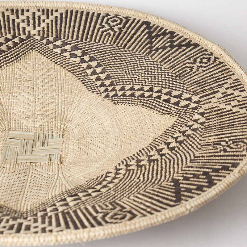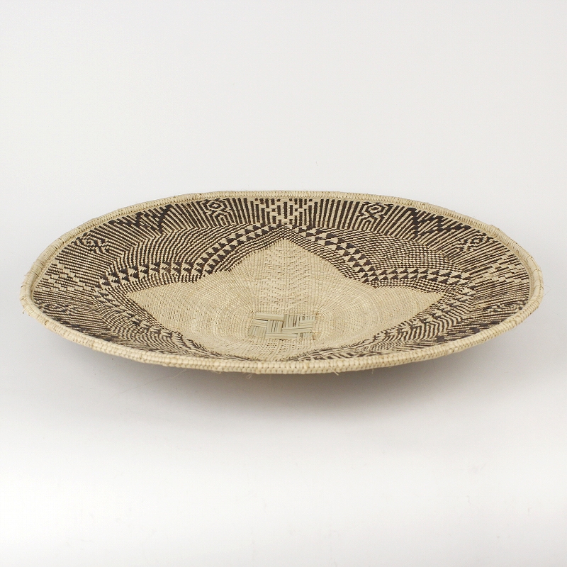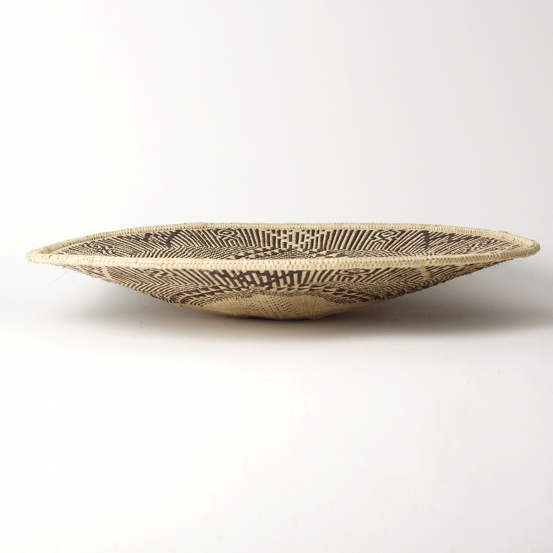 トンガバスケットは、ジンバブエ西部のビンガ地方で、 トンガ人の女性たちによってイララ(椰子の葉)を手編みして作られています。もとは穀物を運んだり選別するために使用されていました。 ストライプや蜘蛛の巣模様、稲妻模様などの伝統的なデザインと、四角い底の土台が特徴的。 放射状の葛に、ナチュラルなイララの葉と、樹皮や根、泥で染色を繰り返したブラウンの葉の二色が編み込まれ、二つとして同じ柄がないというの美しいカゴを創り出します。 また壺に似せたカラバッシュカゴをはじめ、様々なフォルムのカゴを器用に編み上げます。 これらは干ばつと貧困に見舞われやすい地域に住むトンガの人々にとって、貴重な現金収入となっています。 ひとつひとつ表情が異なるバスケットは、インテリアアイテムとして近年注目されています。