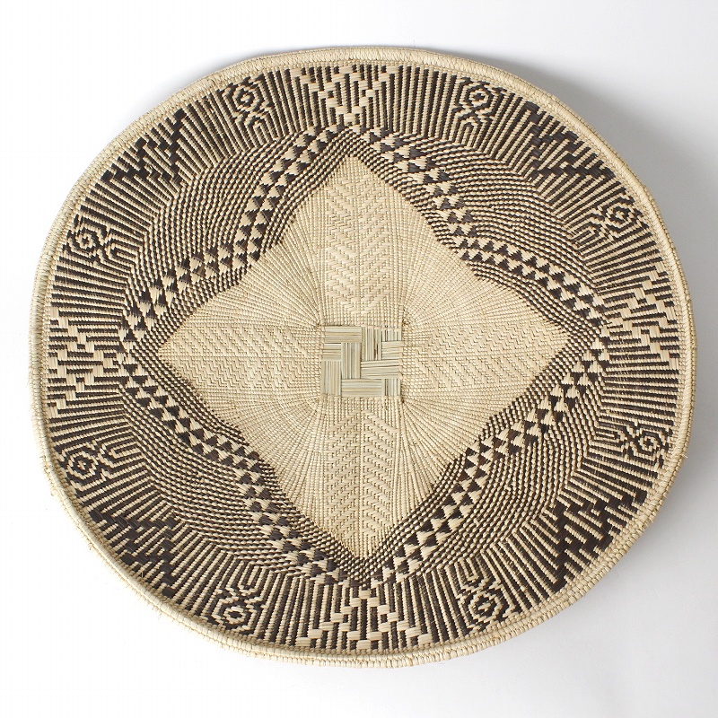 ニャミニャミバスケット:ザンビアからは大変珍しいバスケットが多数届きました。 ムニュムブエの人たちが手作りしたニャミニャミバスケット。ニャミニャミ(Nyami Nyami)とは波型の意味で、ザンベジ川に棲む川の神の名前でもあるそうです。 白い部分はイララ椰子、焦げ茶の透かし部分は水草を使用したデザイン。高いかご編み技術ならではの個性的なフォルムのバスケット。 他にも鳥の巣のようなタティンガもつれバスケット、婚礼の贈り物として母から娘へと代々受け継がれているマケンゲウェディングバスケットなどなど、 ザンビアは貴重なアフリカンバスケットの宝庫です。唯一無二の、芸術性の高いバスケットをご覧ください。