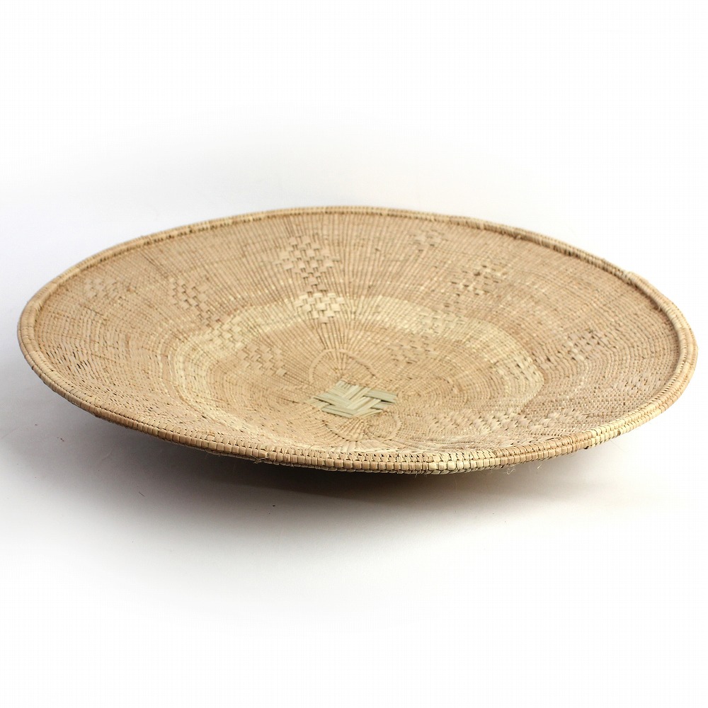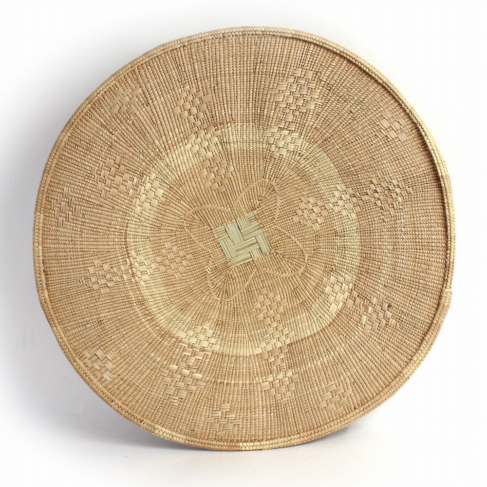 ジンバブエ西部ワンゲ(Hwange)地方で編まれているバスケット大き目サイズです。トンガサングエバスケットより白っぽい仕上がりで、細かい編みと縁の処理が特徴です。イララと呼ばれるパーム椰子を編み込み柄は実に多種多様、一つとして同じ柄が無いほどです。落ち着いた草木染のナチュラルカラーで、どんなインテリアにもマッチします。
