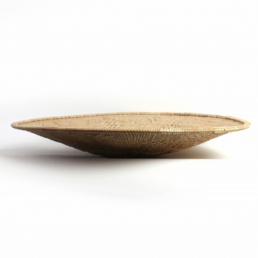 トンガバスケットは、ジンバブエ西部のビンガ地方で、 トンガ人の女性たちによってイララ(椰子の葉)を手編みして作られています。もとは穀物を運んだり選別するために使用されていました。 ストライプや蜘蛛の巣模様、稲妻模様などの伝統的なデザインと、四角い底の土台が特徴的。 放射状の葛に、ナチュラルなイララの葉と、樹皮や根、泥で染色を繰り返したブラウンの葉の二色が編み込まれ、二つとして同じ柄がないというの美しいカゴを創り出します。 また壺に似せたカラバッシュカゴをはじめ、様々なフォルムのカゴを器用に編み上げます。 これらは干ばつと貧困に見舞われやすい地域に住むトンガの人々にとって、貴重な現金収入となっています。 ひとつひとつ表情が異なるバスケットは、インテリアアイテムとして近年注目されています。