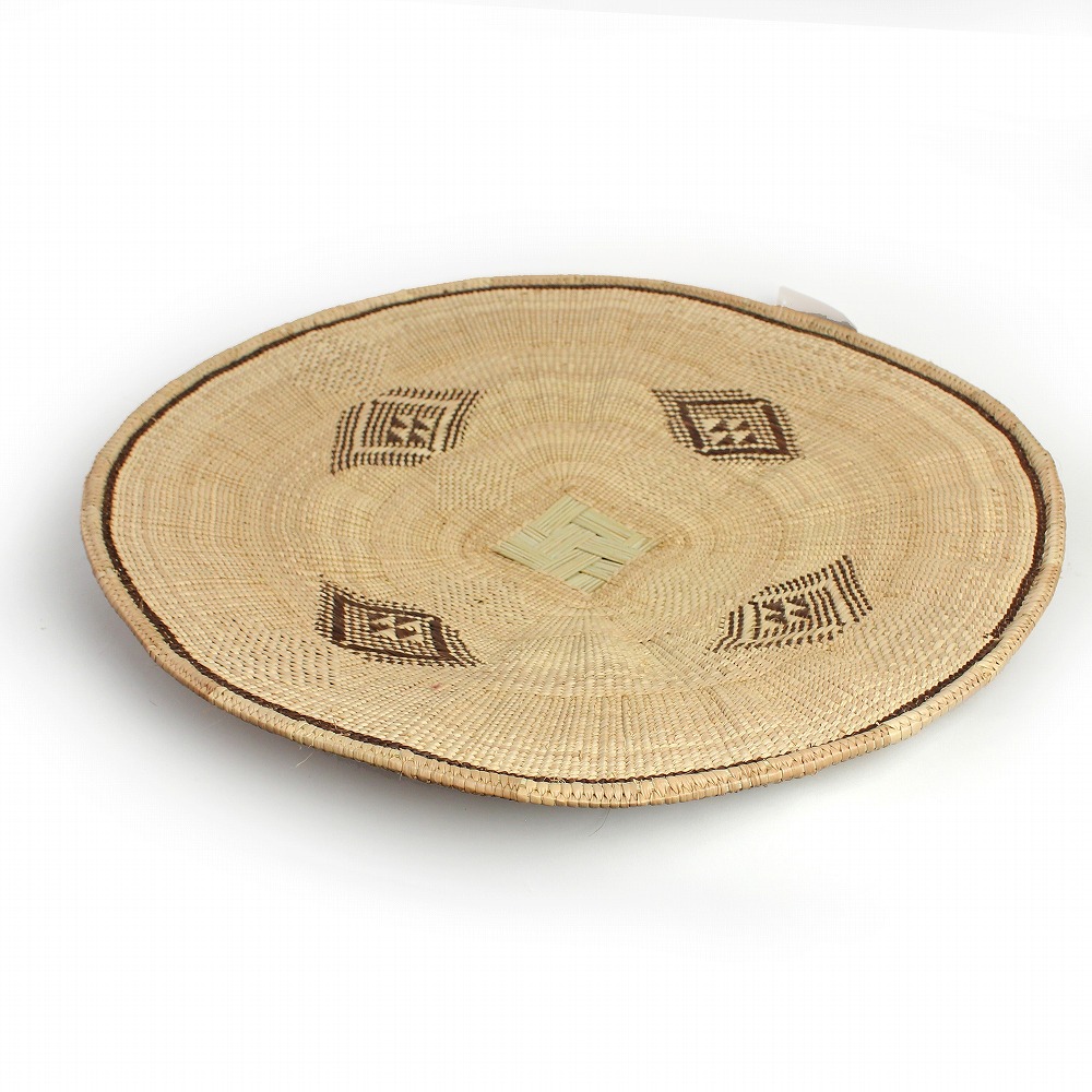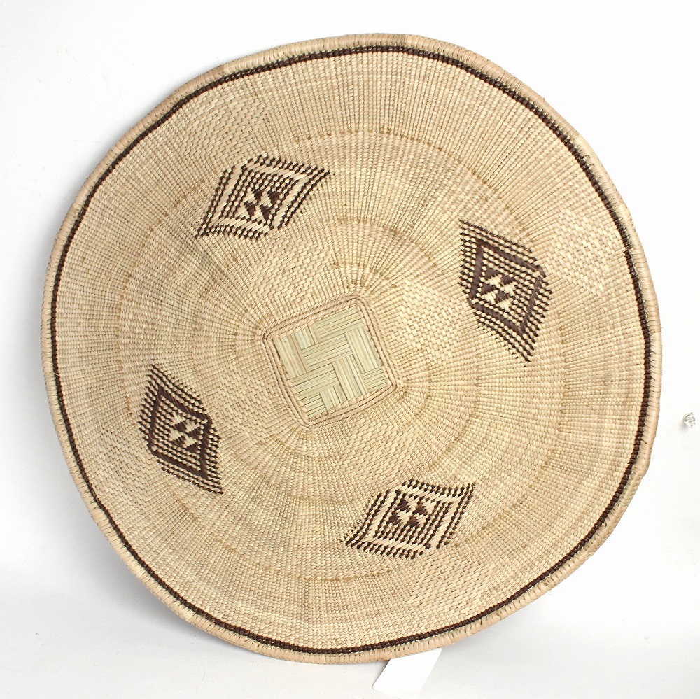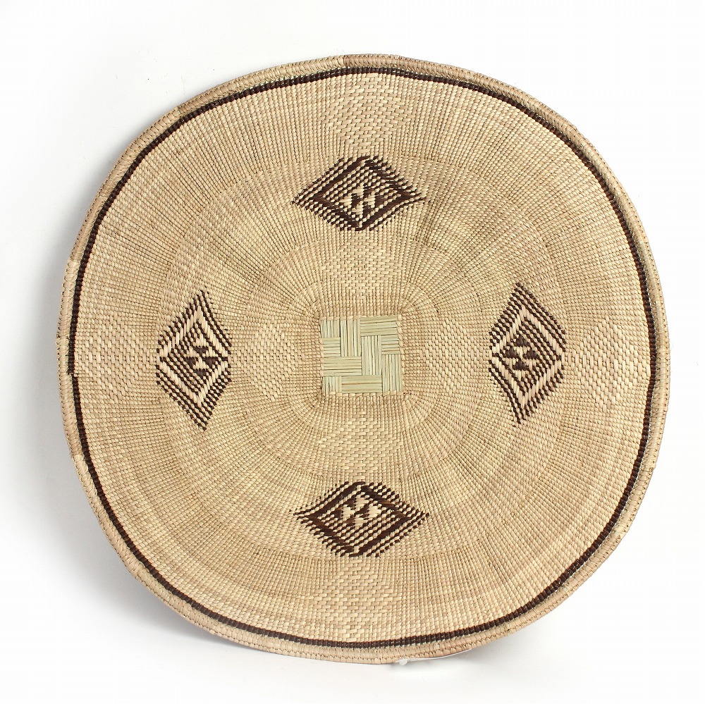 トンガバスケットは、ジンバブエ西部のビンガ地方で、 トンガ人の女性たちによってイララ(椰子の葉)を手編みして作られています。もとは穀物を運んだり選別するために使用されていました。 ストライプや蜘蛛の巣模様、稲妻模様などの伝統的なデザインと、四角い底の土台が特徴的。 放射状の葛に、ナチュラルなイララの葉と、樹皮や根、泥で染色を繰り返したブラウンの葉の二色が編み込まれ、二つとして同じ柄がないというの美しいカゴを創り出します。 また壺に似せたカラバッシュカゴをはじめ、様々なフォルムのカゴを器用に編み上げます。 これらは干ばつと貧困に見舞われやすい地域に住むトンガの人々にとって、貴重な現金収入となっています。 ひとつひとつ表情が異なるバスケットは、インテリアアイテムとして近年注目されています。