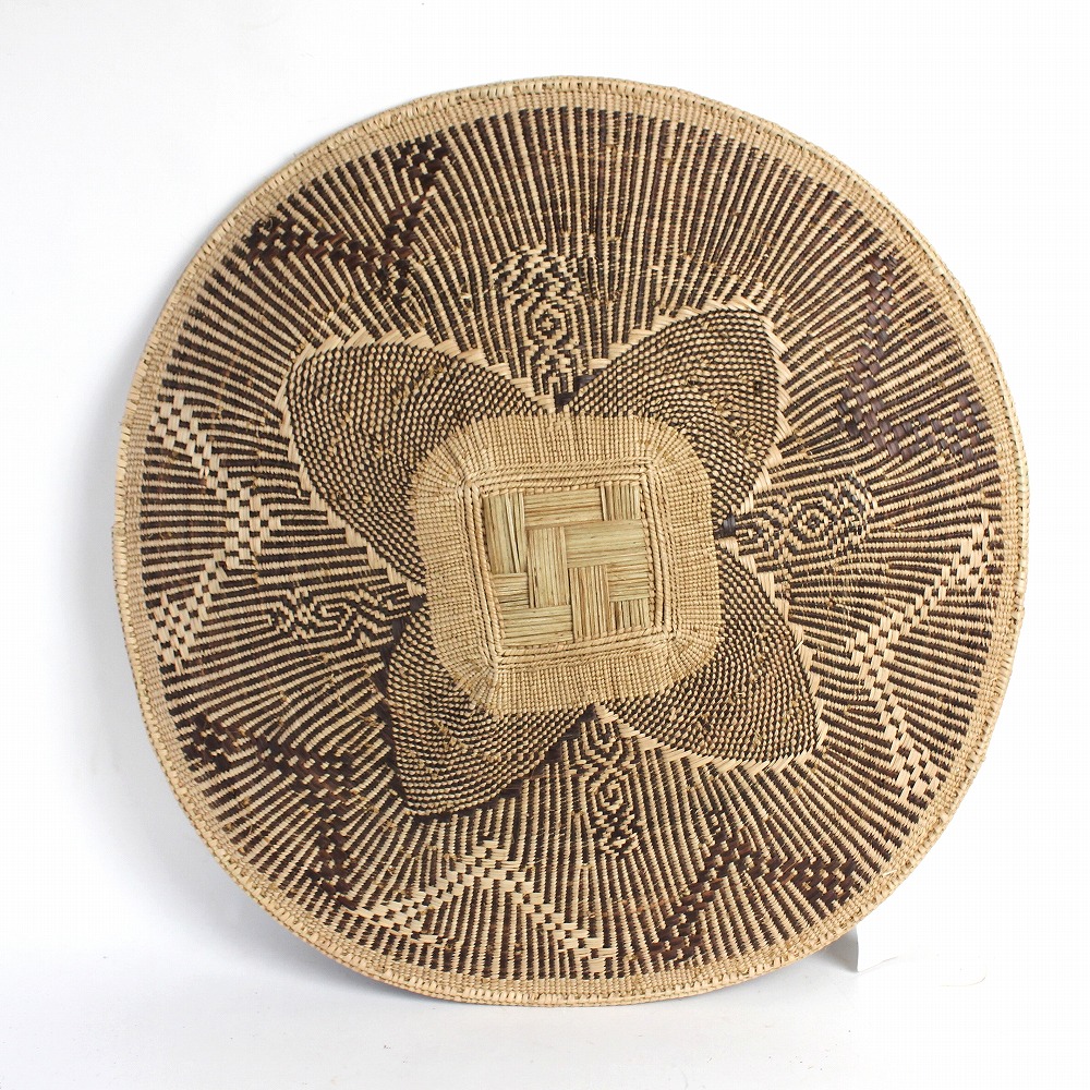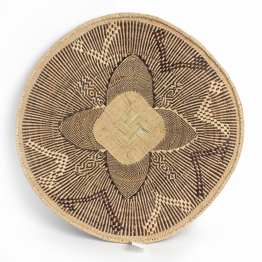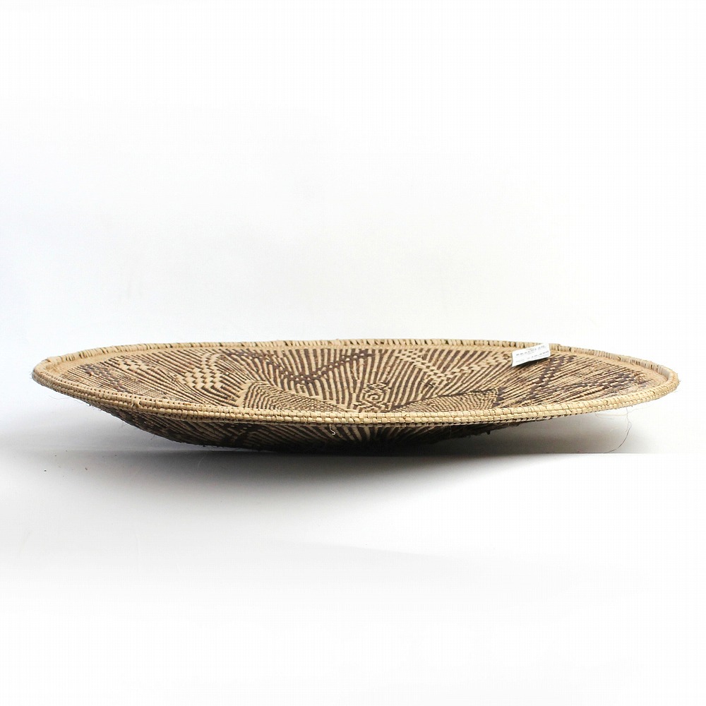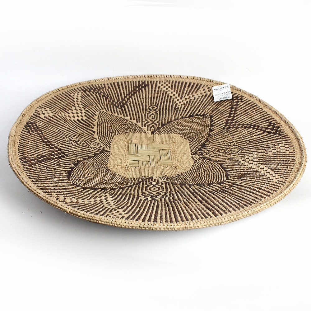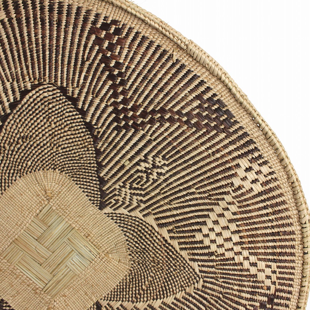 トンガバスケットは、ジンバブエ西部のビンガ地方で、 トンガ人の女性たちによってイララ(椰子の葉)を手編みして作られています。もとは穀物を運んだり選別するために使用されていました。 ストライプや蜘蛛の巣模様、稲妻模様などの伝統的なデザインと、四角い底の土台が特徴的。 放射状の葛に、ナチュラルなイララの葉と、樹皮や根、泥で染色を繰り返したブラウンの葉の二色が編み込まれ、二つとして同じ柄がないというの美しいカゴを創り出します。 また壺に似せたカラバッシュカゴをはじめ、様々なフォルムのカゴを器用に編み上げます。 これらは干ばつと貧困に見舞われやすい地域に住むトンガの人々にとって、貴重な現金収入となっています。 ひとつひとつ表情が異なるバスケットは、インテリアアイテムとして近年注目されています。