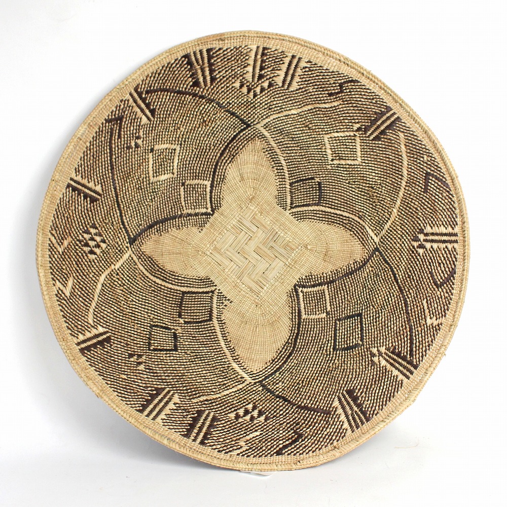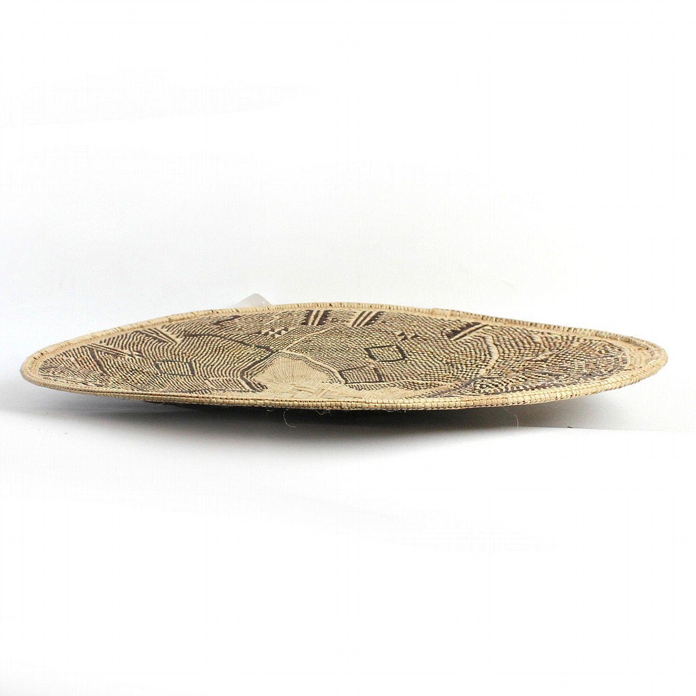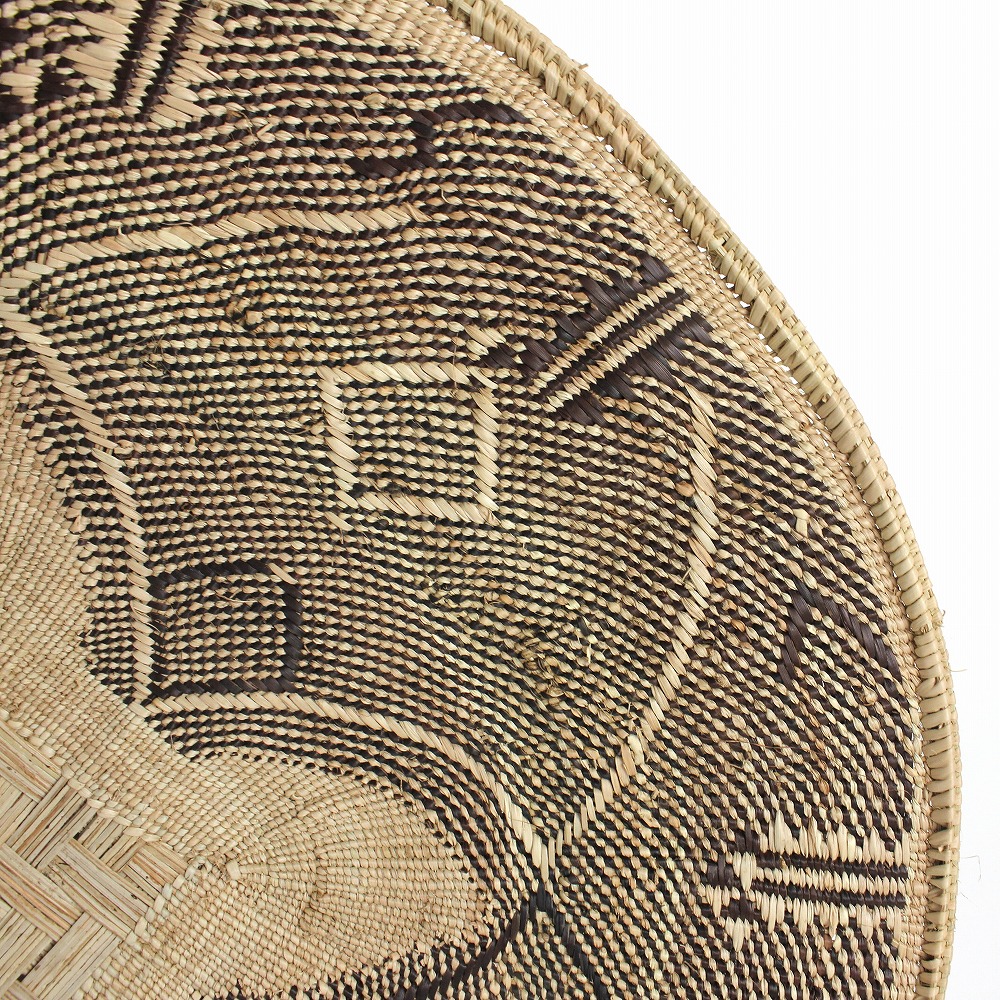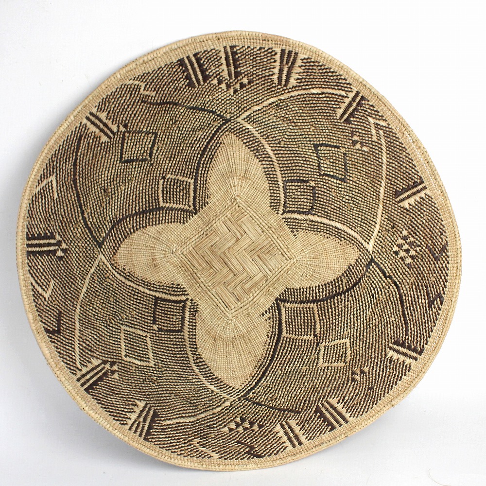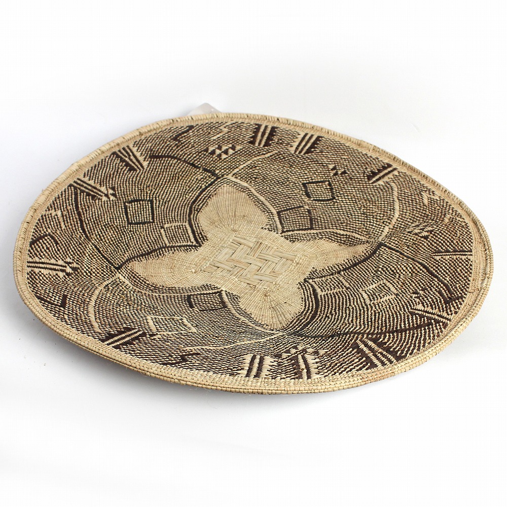 トンガバスケットは、ジンバブエ西部のビンガ地方で、 トンガ人の女性たちによってイララ(椰子の葉)を手編みして作られています。もとは穀物を運んだり選別するために使用されていました。 ストライプや蜘蛛の巣模様、稲妻模様などの伝統的なデザインと、四角い底の土台が特徴的。 放射状の葛に、ナチュラルなイララの葉と、樹皮や根、泥で染色を繰り返したブラウンの葉の二色が編み込まれ、二つとして同じ柄がないというの美しいカゴを創り出します。 また壺に似せたカラバッシュカゴをはじめ、様々なフォルムのカゴを器用に編み上げます。 これらは干ばつと貧困に見舞われやすい地域に住むトンガの人々にとって、貴重な現金収入となっています。 ひとつひとつ表情が異なるバスケットは、インテリアアイテムとして近年注目されています。