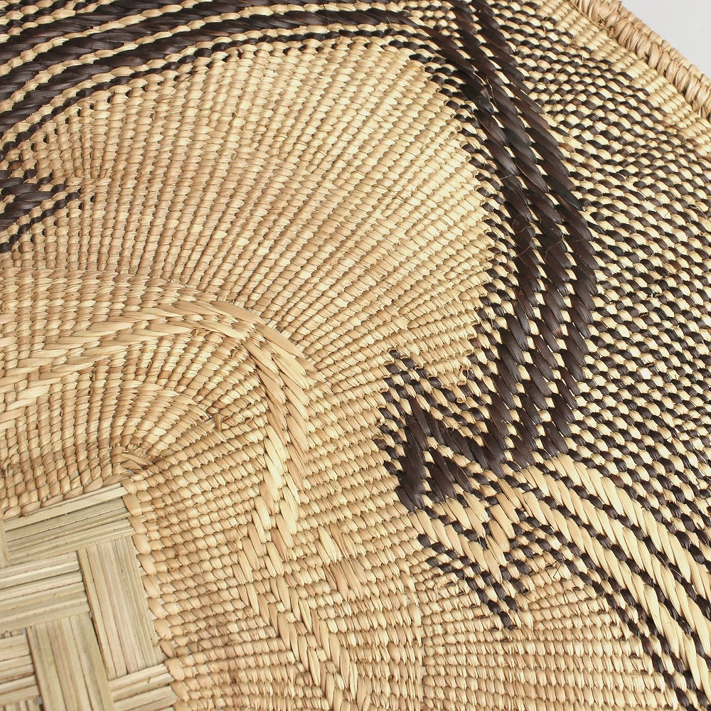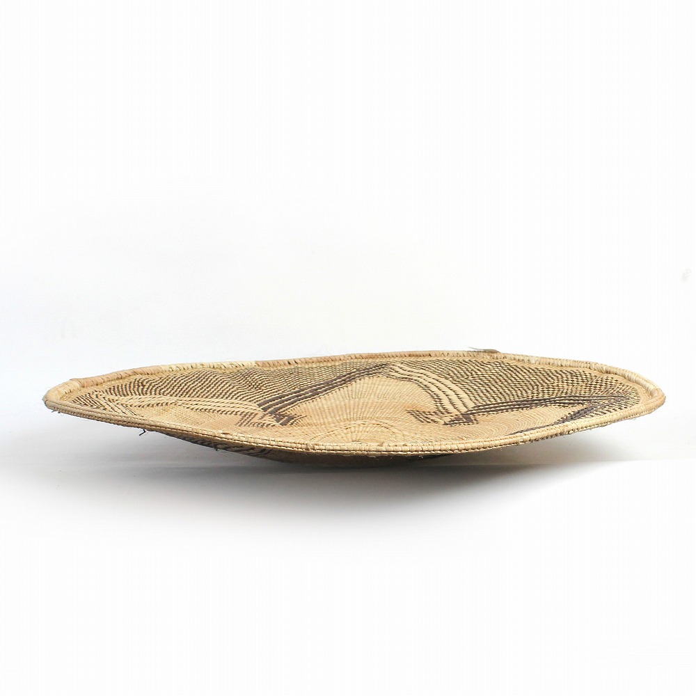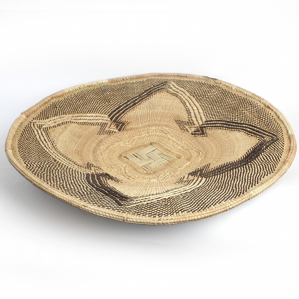 トンガバスケットは、ジンバブエ西部のビンガ地方で、 トンガ人の女性たちによってイララ(椰子の葉)を手編みして作られています。もとは穀物を運んだり選別するために使用されていました。 ストライプや蜘蛛の巣模様、稲妻模様などの伝統的なデザインと、四角い底の土台が特徴的。 放射状の葛に、ナチュラルなイララの葉と、樹皮や根、泥で染色を繰り返したブラウンの葉の二色が編み込まれ、二つとして同じ柄がないというの美しいカゴを創り出します。 また壺に似せたカラバッシュカゴをはじめ、様々なフォルムのカゴを器用に編み上げます。 これらは干ばつと貧困に見舞われやすい地域に住むトンガの人々にとって、貴重な現金収入となっています。 ひとつひとつ表情が異なるバスケットは、インテリアアイテムとして近年注目されています。