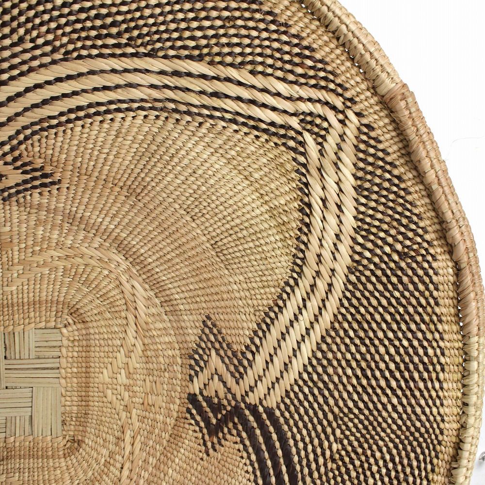 ジンバブエ西部ワンゲ(Hwange)地方で編まれているバスケット大き目サイズです。トンガサングエバスケットより白っぽい仕上がりで、細かい編みと縁の処理が特徴です。イララと呼ばれるパーム椰子を編み込み柄は実に多種多様、一つとして同じ柄が無いほどです。落ち着いた草木染のナチュラルカラーで、どんなインテリアにもマッチします。