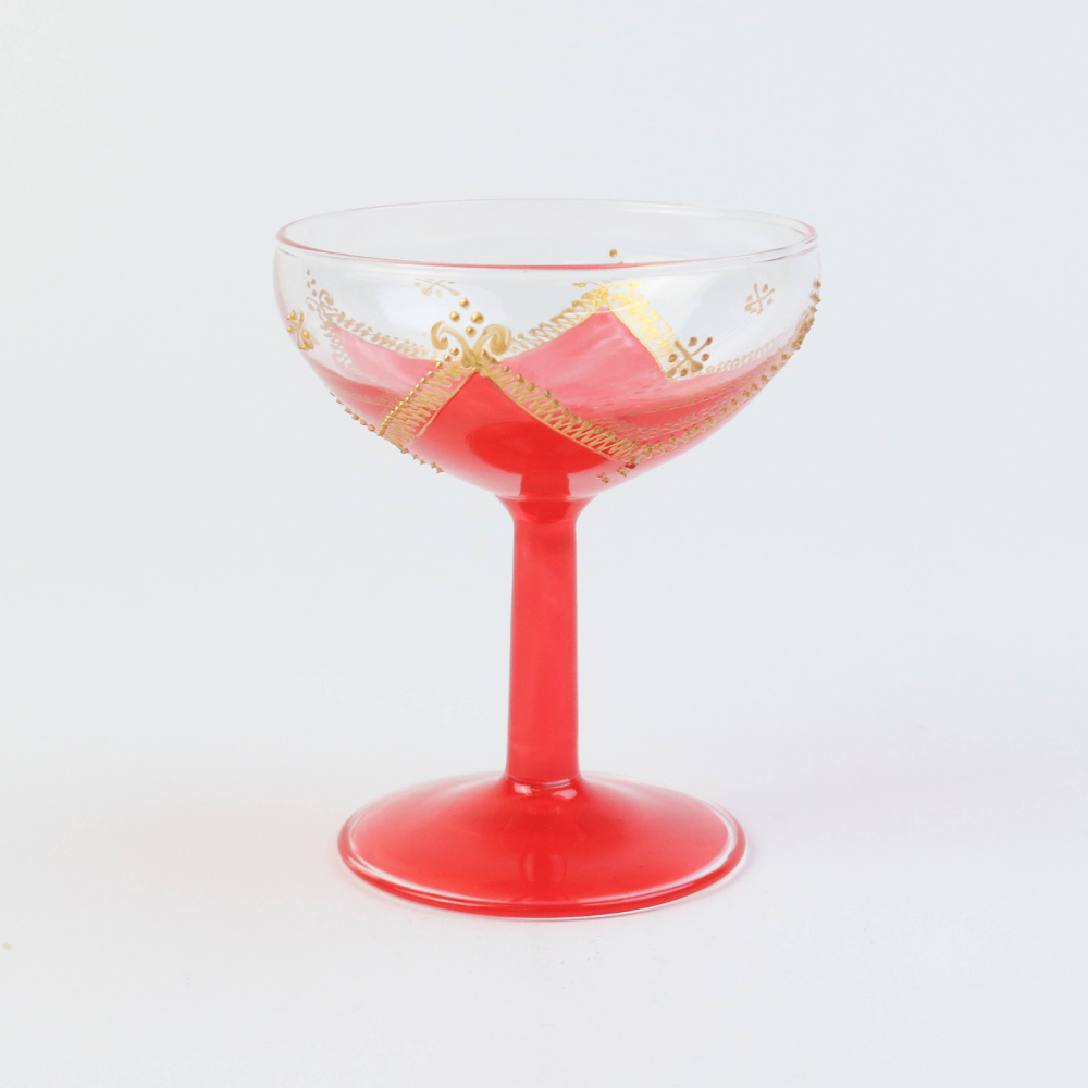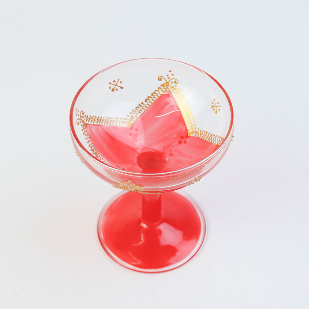 モロッコのエキゾチックな絵柄の手描きのカクテルグラスです。リサイクルグラスに、一つ一つ職人さんが丁寧に手描きした風合いあるデザインと豊富なカラーが魅力的です。こちらは食品検査を通していない商品なので、雑貨としてご使用ください。