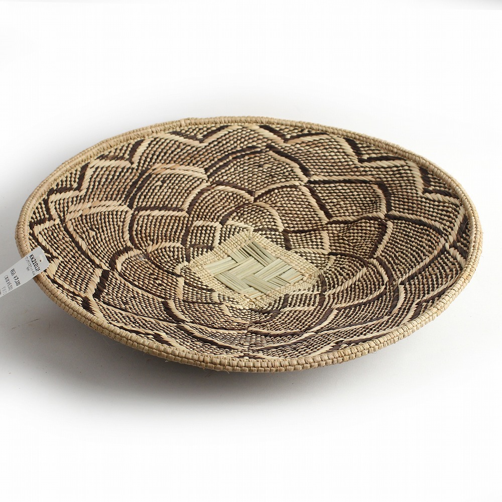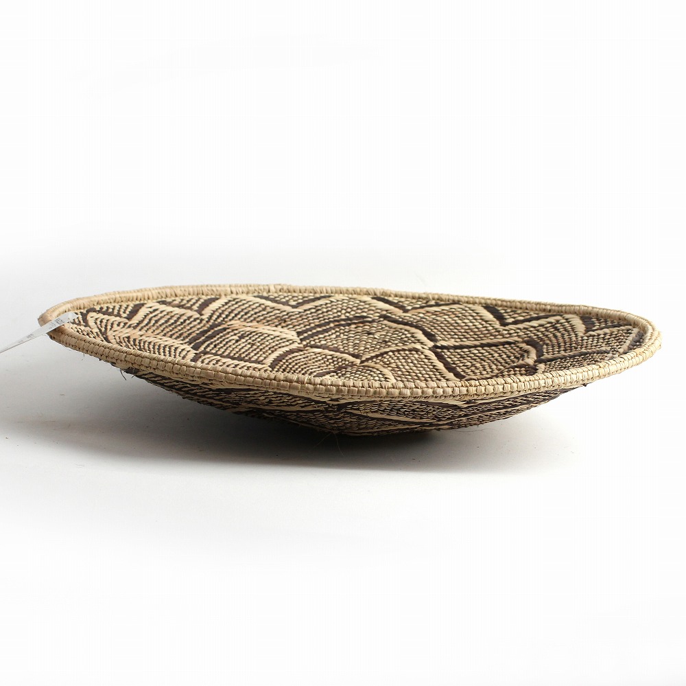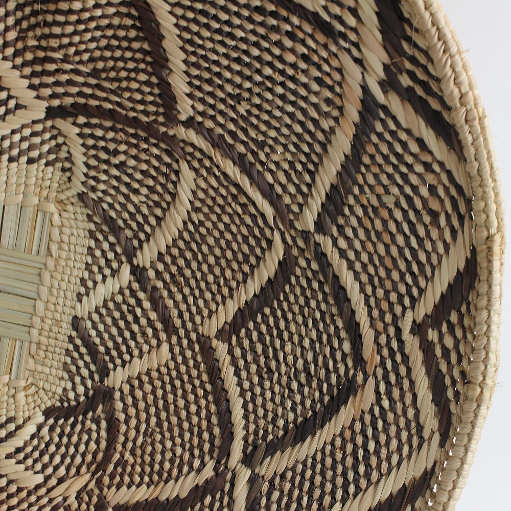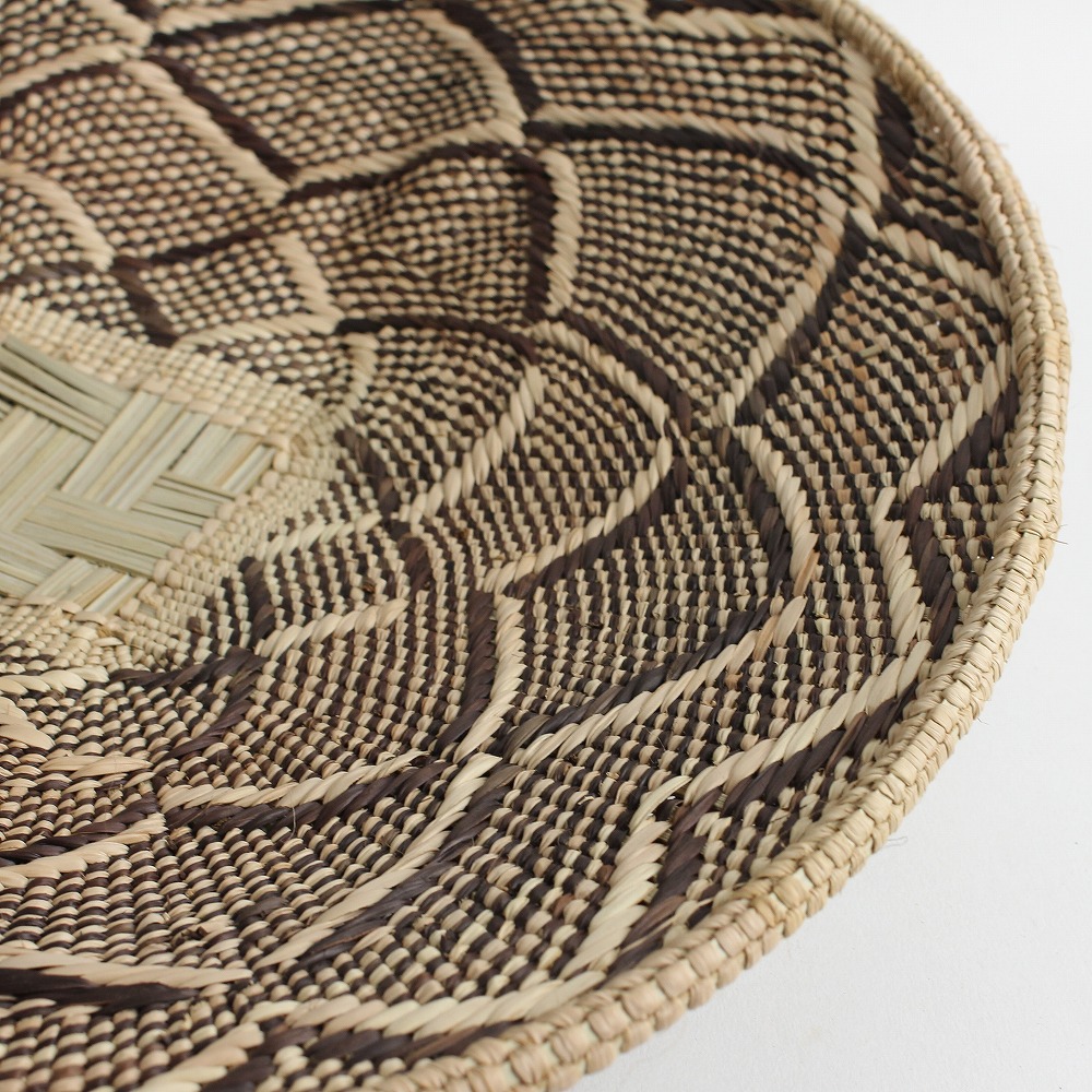 トンガバスケットは、ジンバブエ西部のビンガ地方で、 トンガ人の女性たちによってイララ(椰子の葉)を手編みして作られています。もとは穀物を運んだり選別するために使用されていました。 ストライプや蜘蛛の巣模様、稲妻模様などの伝統的なデザインと、四角い底の土台が特徴的。 放射状の葛に、ナチュラルなイララの葉と、樹皮や根、泥で染色を繰り返したブラウンの葉の二色が編み込まれ、二つとして同じ柄がないというの美しいカゴを創り出します。 また壺に似せたカラバッシュカゴをはじめ、様々なフォルムのカゴを器用に編み上げます。 これらは干ばつと貧困に見舞われやすい地域に住むトンガの人々にとって、貴重な現金収入となっています。 ひとつひとつ表情が異なるバスケットは、インテリアアイテムとして近年注目されています。