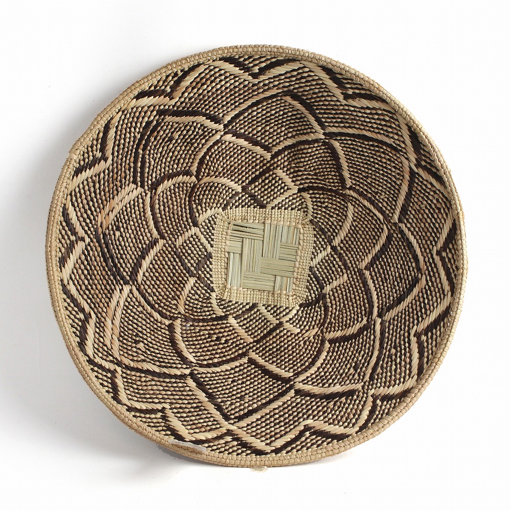 ニャミニャミバスケット:ザンビアからは大変珍しいバスケットが多数届きました。 ムニュムブエの人たちが手作りしたニャミニャミバスケット。ニャミニャミ(Nyami Nyami)とは波型の意味で、ザンベジ川に棲む川の神の名前でもあるそうです。 白い部分はイララ椰子、焦げ茶の透かし部分は水草を使用したデザイン。高いかご編み技術ならではの個性的なフォルムのバスケット。 他にも鳥の巣のようなタティンガもつれバスケット、婚礼の贈り物として母から娘へと代々受け継がれているマケンゲウェディングバスケットなどなど、 ザンビアは貴重なアフリカンバスケットの宝庫です。唯一無二の、芸術性の高いバスケットをご覧ください。