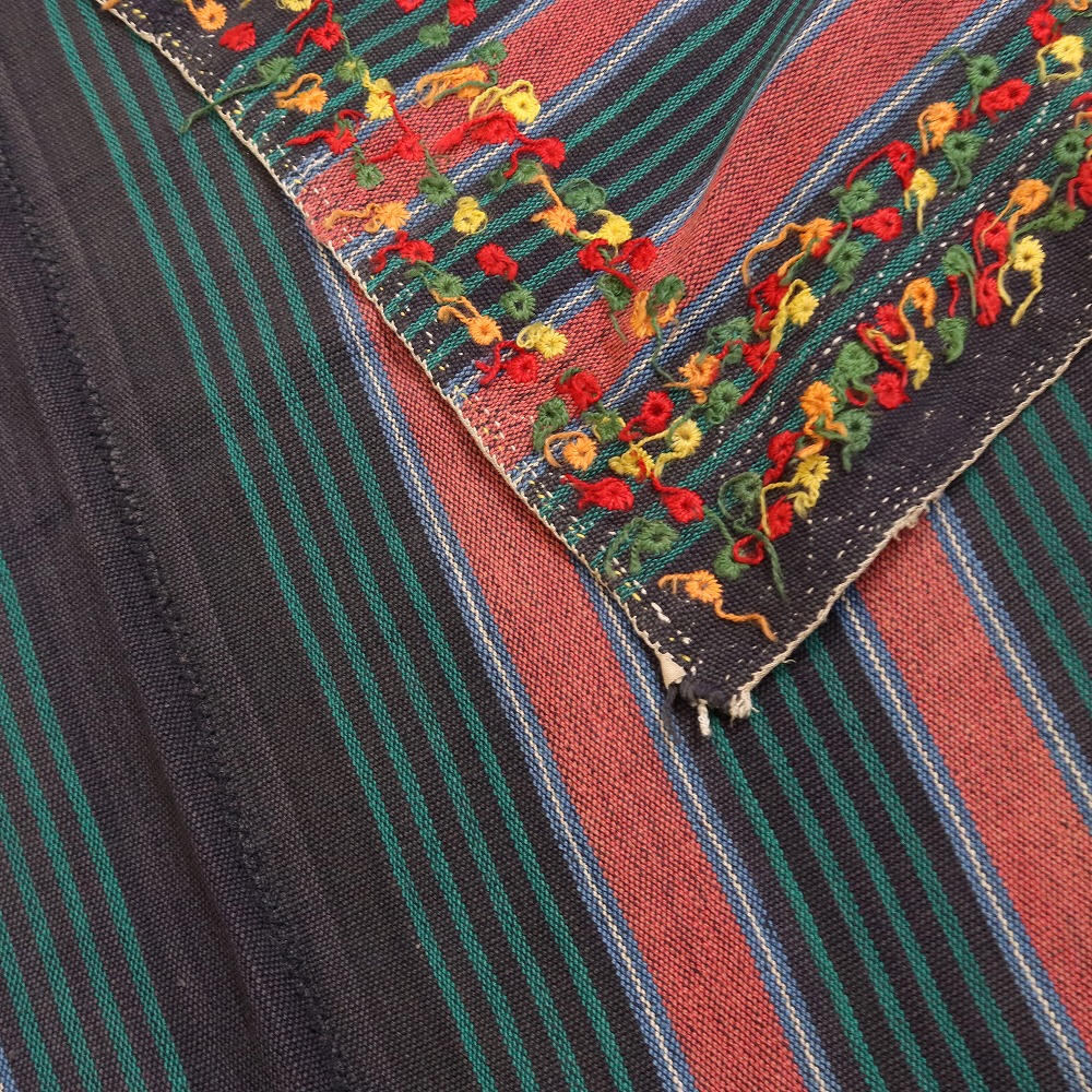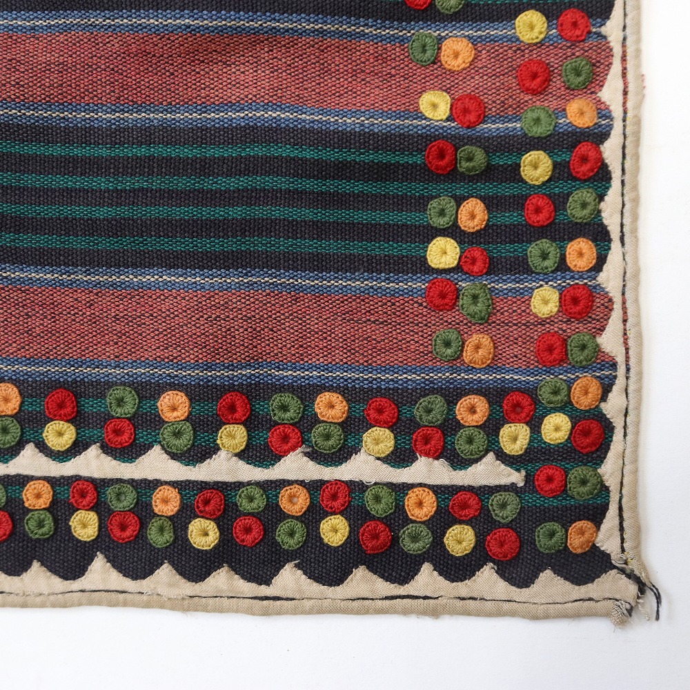 抽象的な意味をもつカラフルな刺繍で引き立てられたインディゴ染めの薄い布です。アフリカの藍に鮮やかな刺繍が映える美しいデザインで、タペストリーやテーブルランナーなどインテリアのアクセントに幅広くご利用いただけます。