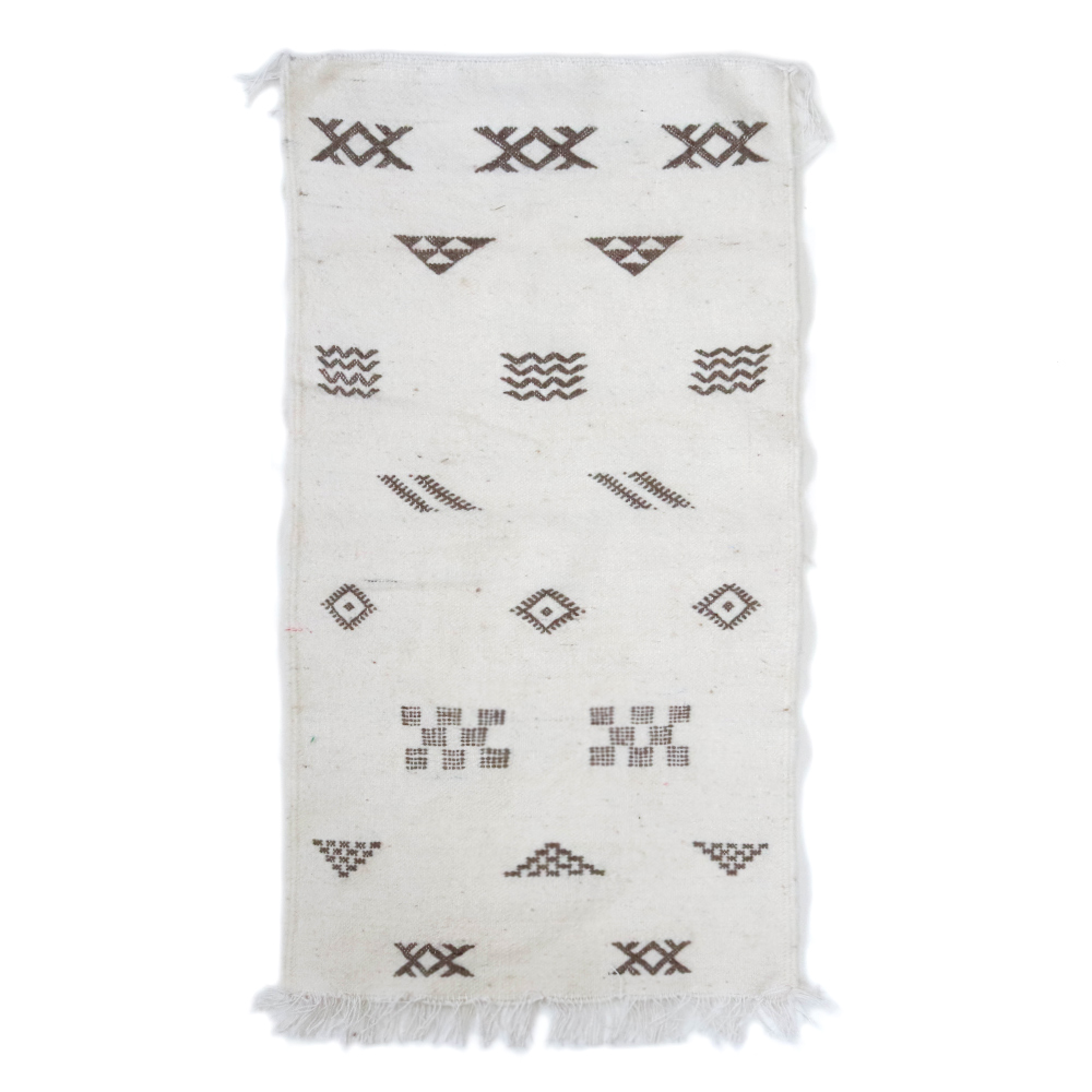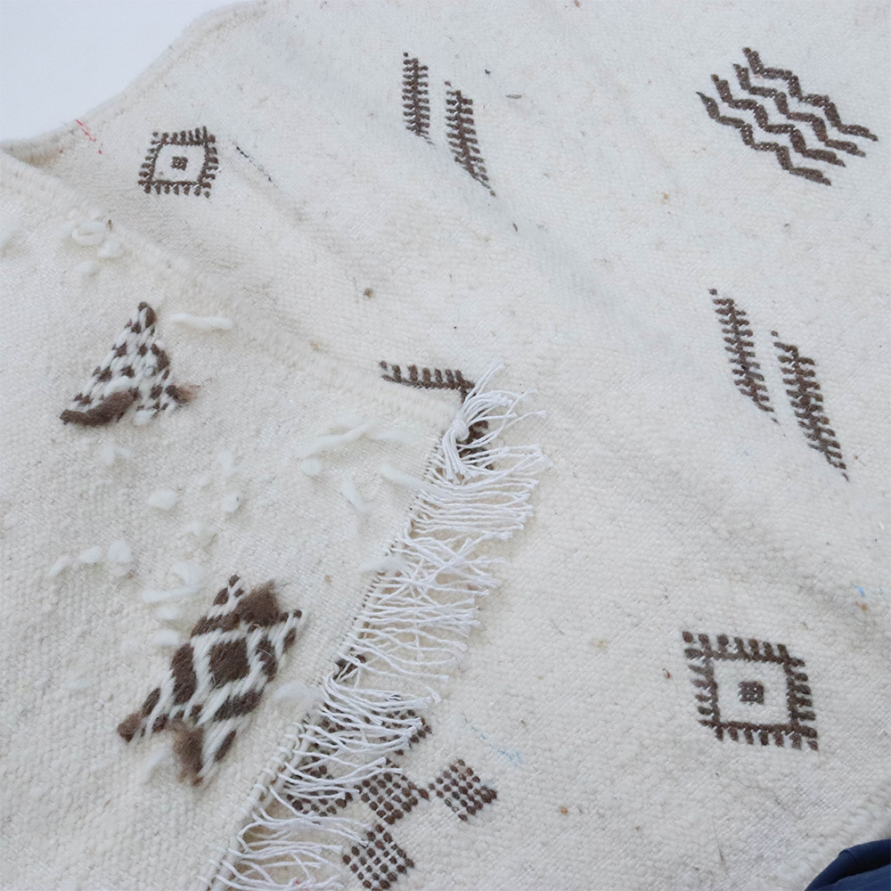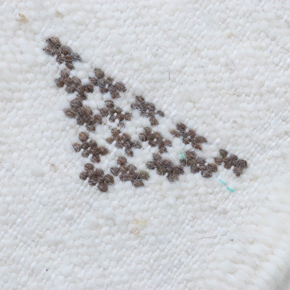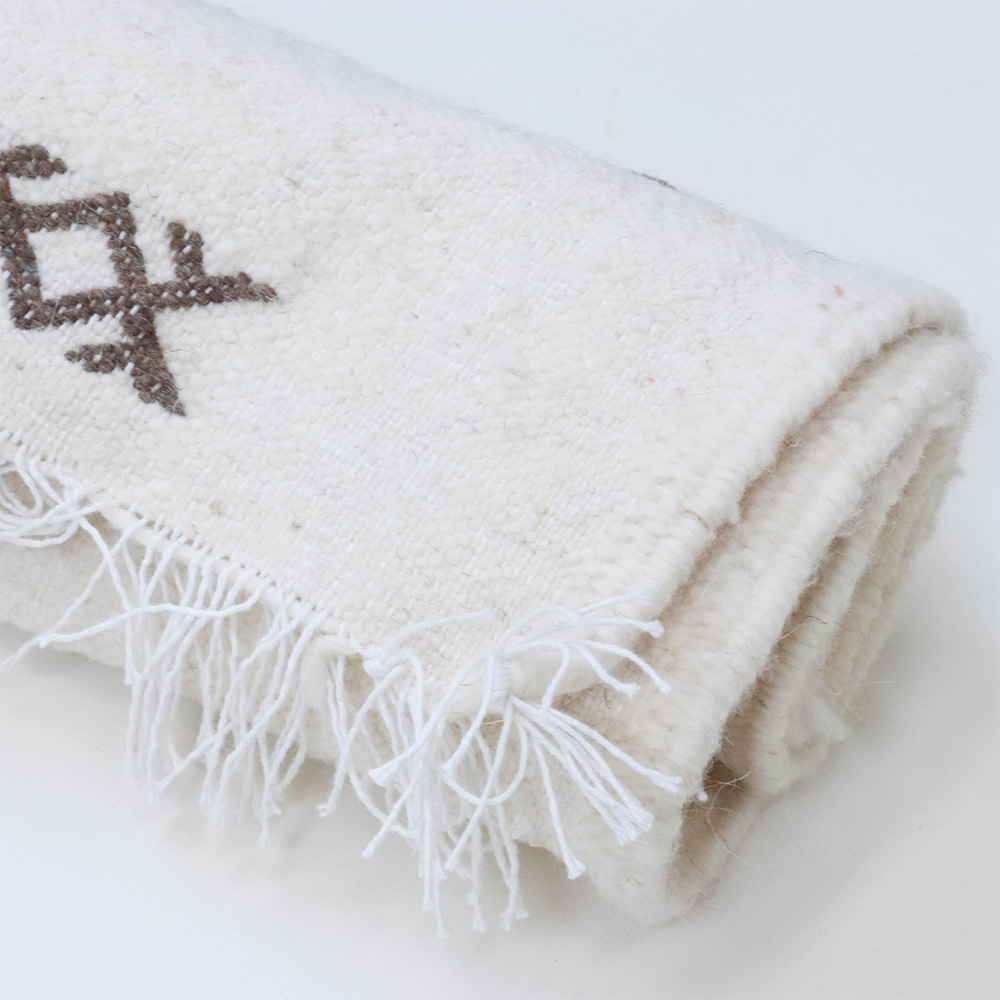 ワッザン地方で作られている絨毯、薄手タイプ一点物です。オフホワイトのベースに、象徴的なモチーフを織り込んだ洗練されたデザイン。薄手の羊毛ラグは、冬暖かく夏は素足に気持ちよく、オールシーズン活躍します。リビングやお部屋のポイントに、タペストリーとしても広くお使いいただけます。本物ならではの存在感をお楽しみください。