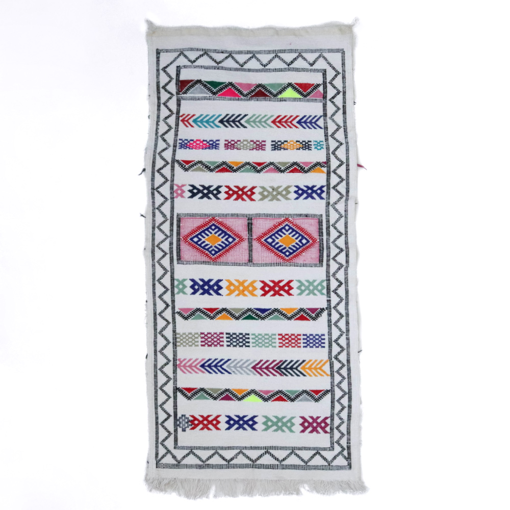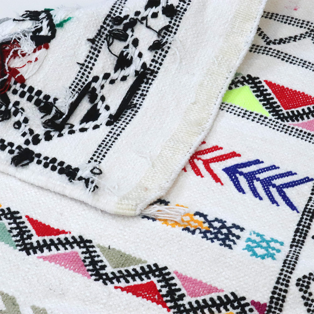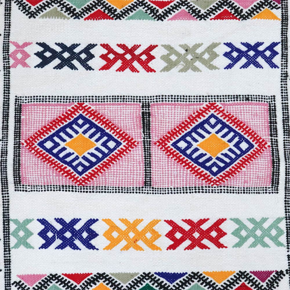 チュニジアのキリムは、縦糸にコットン糸を使用し、ダイヤ形のモチーフRegma(複数形regam)と呼ばれ柄で繰り返し織り込まれます。