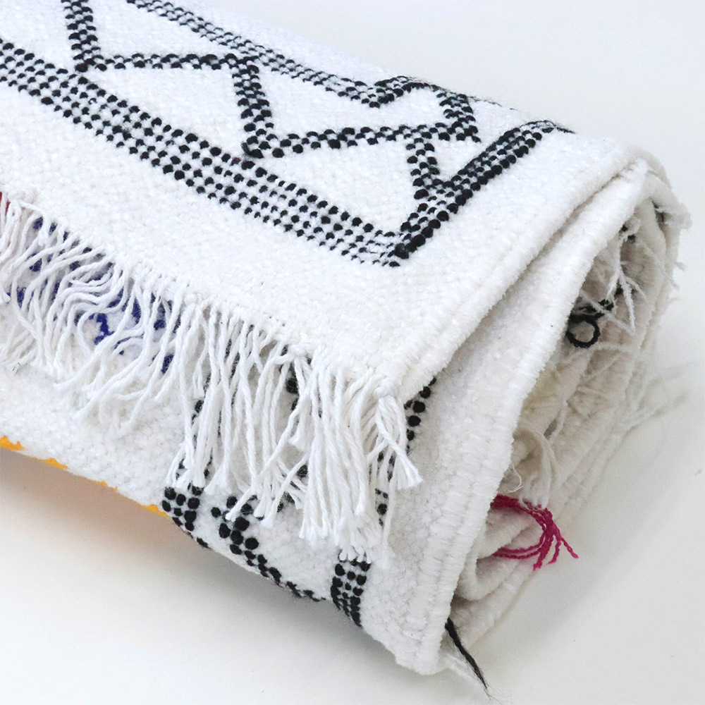 ワッザン地方で作られている絨毯、薄手タイプ一点物です。オフホワイトのベースに、象徴的なモチーフを織り込んだ洗練されたデザイン。薄手の羊毛ラグは、冬暖かく夏は素足に気持ちよく、オールシーズン活躍します。リビングやお部屋のポイントに、タペストリーとしても広くお使いいただけます。本物ならではの存在感をお楽しみください。