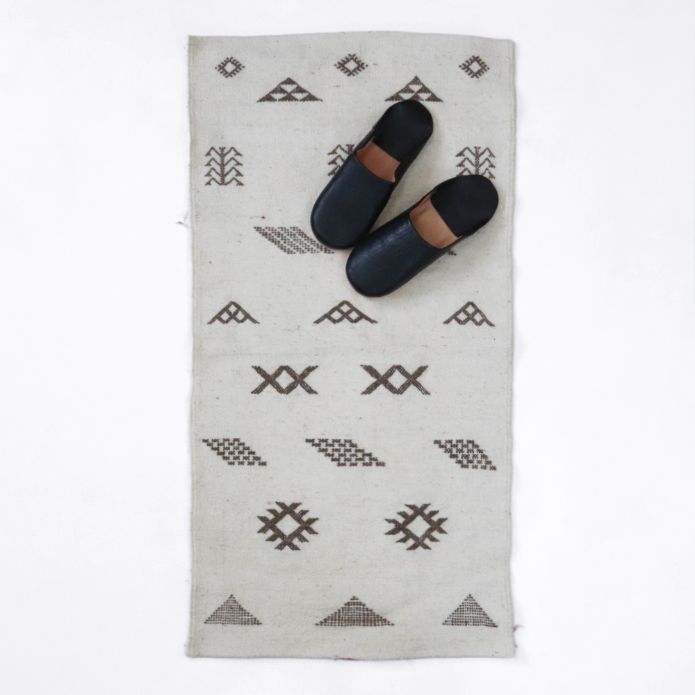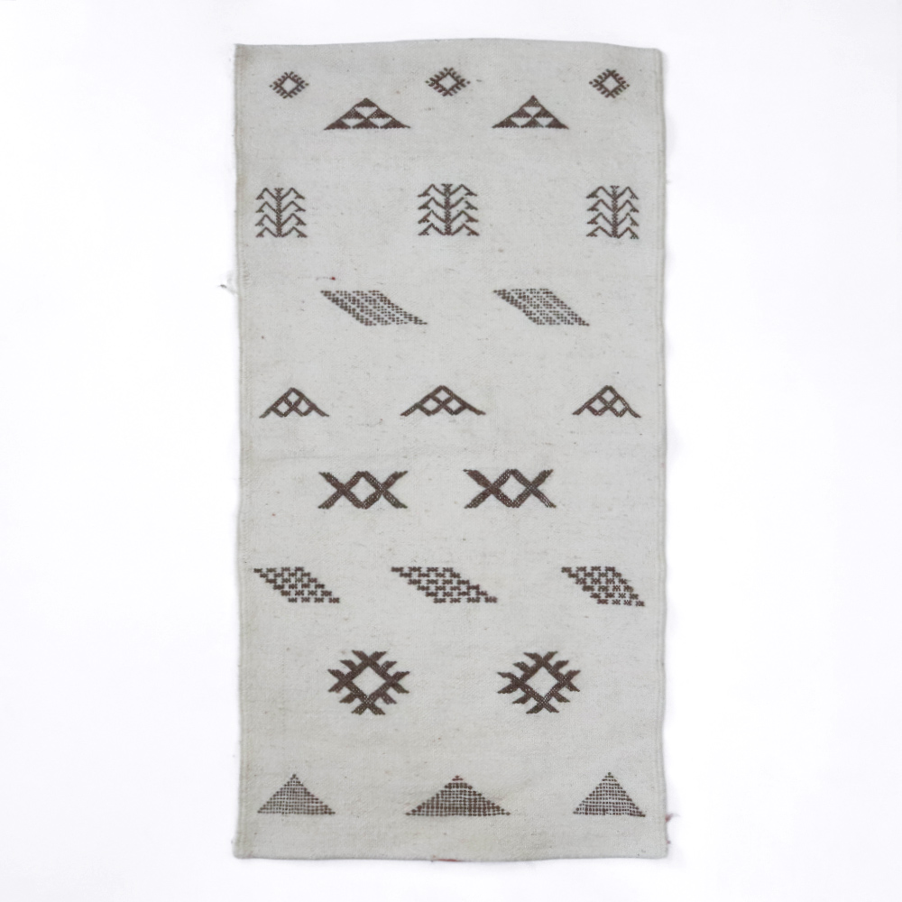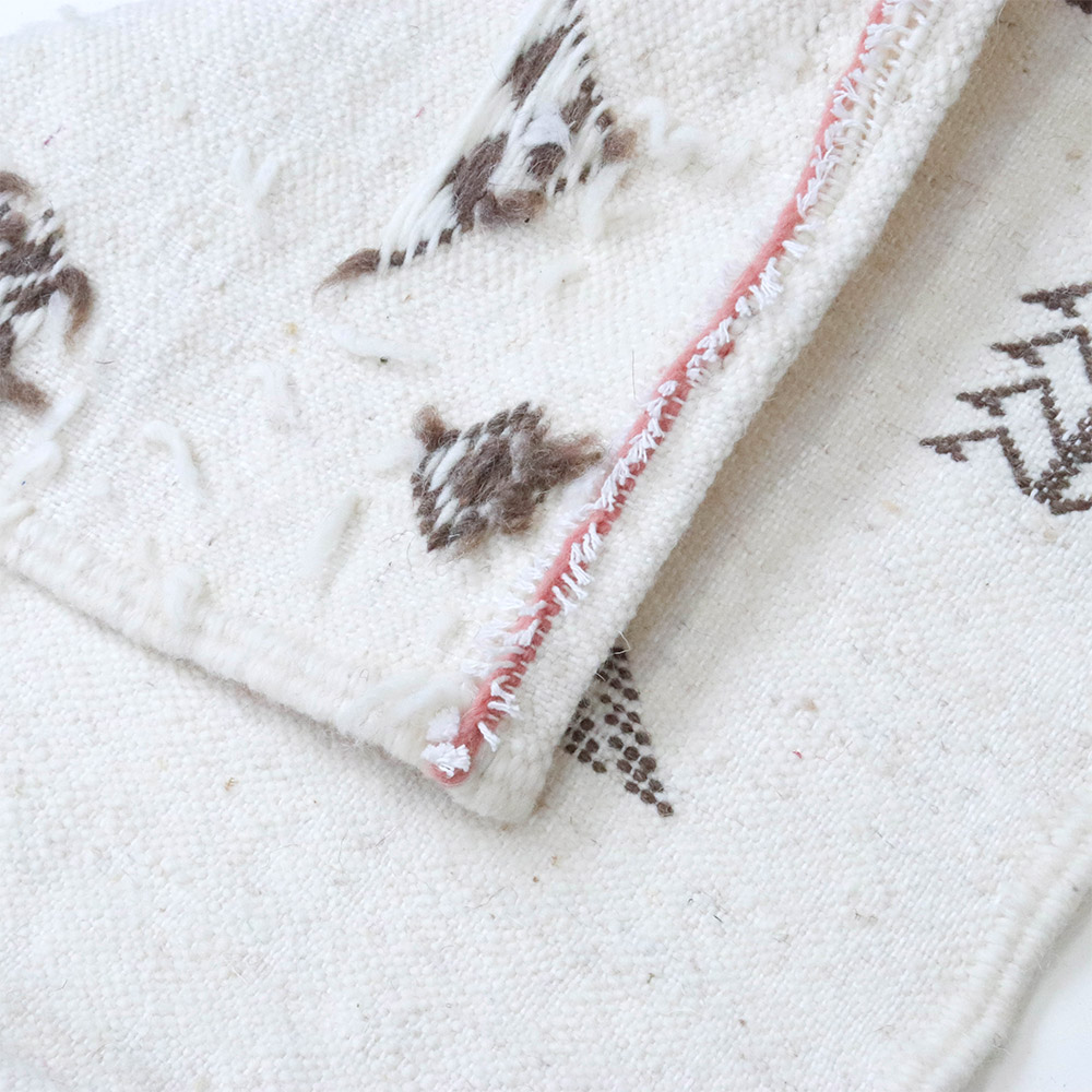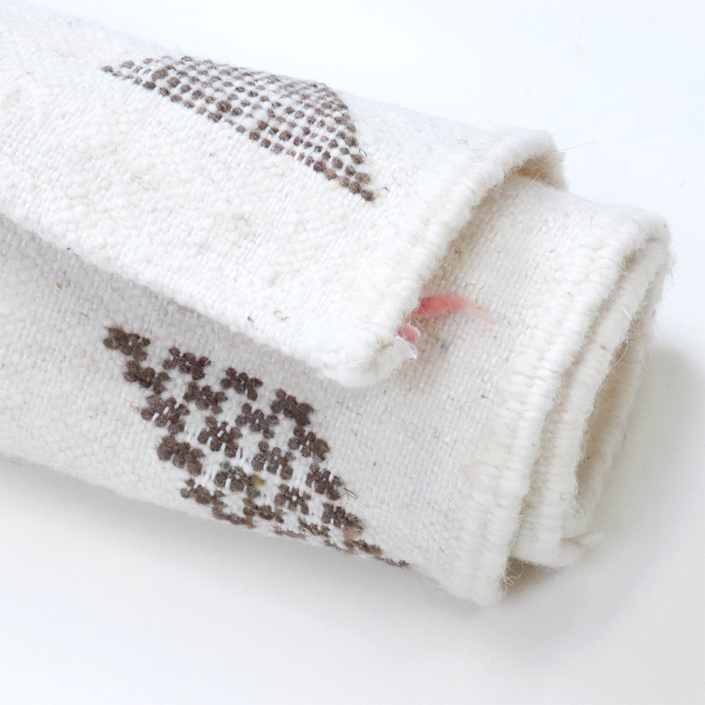 ワッザン地方で作られている絨毯、薄手タイプ一点物です。オフホワイトのベースに、象徴的なモチーフを織り込んだ洗練されたデザイン。薄手の羊毛ラグは、冬暖かく夏は素足に気持ちよく、オールシーズン活躍します。リビングやお部屋のポイントに、タペストリーとしても広くお使いいただけます。本物ならではの存在感をお楽しみください。