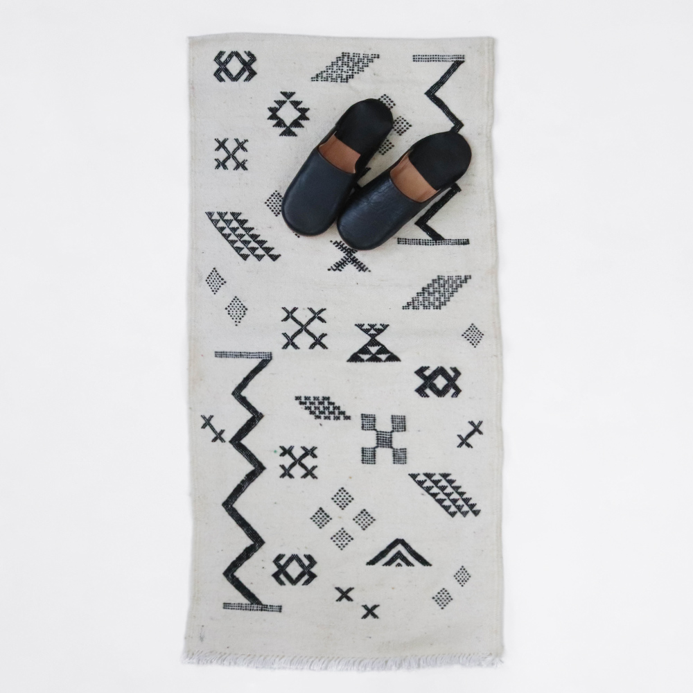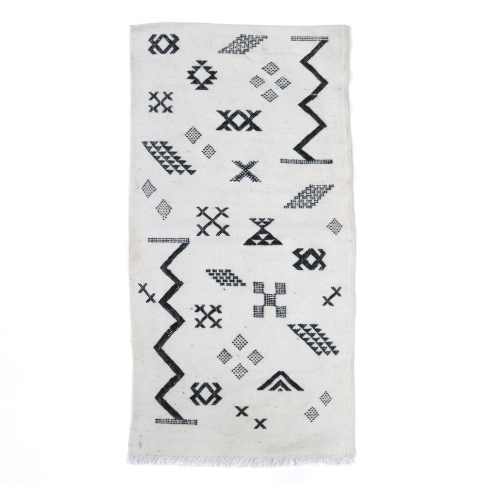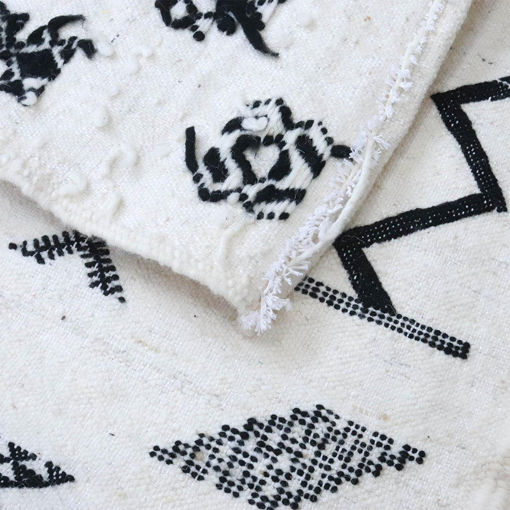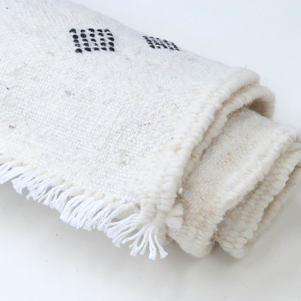 ワッザン地方で作られている絨毯、薄手タイプ一点物です。オフホワイトのベースに、象徴的なモチーフを織り込んだ洗練されたデザイン。薄手の羊毛ラグは、冬暖かく夏は素足に気持ちよく、オールシーズン活躍します。リビングやお部屋のポイントに、タペストリーとしても広くお使いいただけます。本物ならではの存在感をお楽しみください。