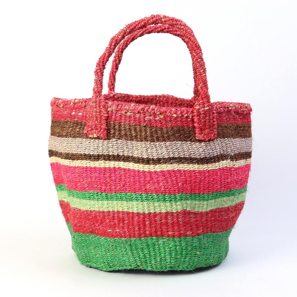 サイザルとはリュウゼツランの一種で、その繊維は歴史的に広く使われていた繊維である麻にちなんでサイザル麻と呼ばれています。ケニアのキクユ人やカンバ人の伝統技術により サイザルで編んだバスケット(=キオンド)は穀物の運搬や保存にケニアでは使われていました。かごを編む技術は母から娘へと受け継がれ、ケニアの小さな農村の女性を中心にひとつひとつ手作りで編み上げています。現在ではサイザルバッグを編むことがケニアの村の重要な現金収入源となり、各家庭の子どもたちの学費となり生活費の足しとなっています。