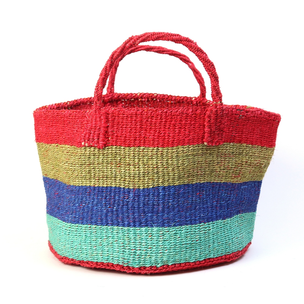 サイザルとはリュウゼツランの一種で、その繊維は歴史的に広く使われていた繊維である麻にちなんでサイザル麻と呼ばれています。ケニアのキクユ人やカンバ人の伝統技術により サイザルで編んだバスケット(=キオンド)は穀物の運搬や保存にケニアでは使われていました。かごを編む技術は母から娘へと受け継がれ、ケニアの小さな農村の女性を中心にひとつひとつ手作りで編み上げています。現在ではサイザルバッグを編むことがケニアの村の重要な現金収入源となり、各家庭の子どもたちの学費となり生活費の足しとなっています。