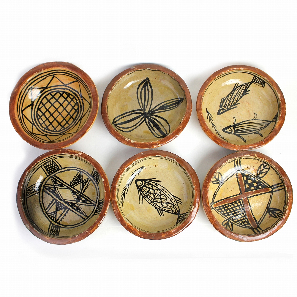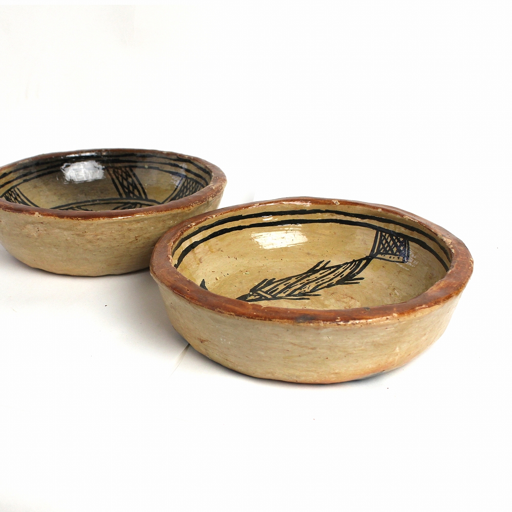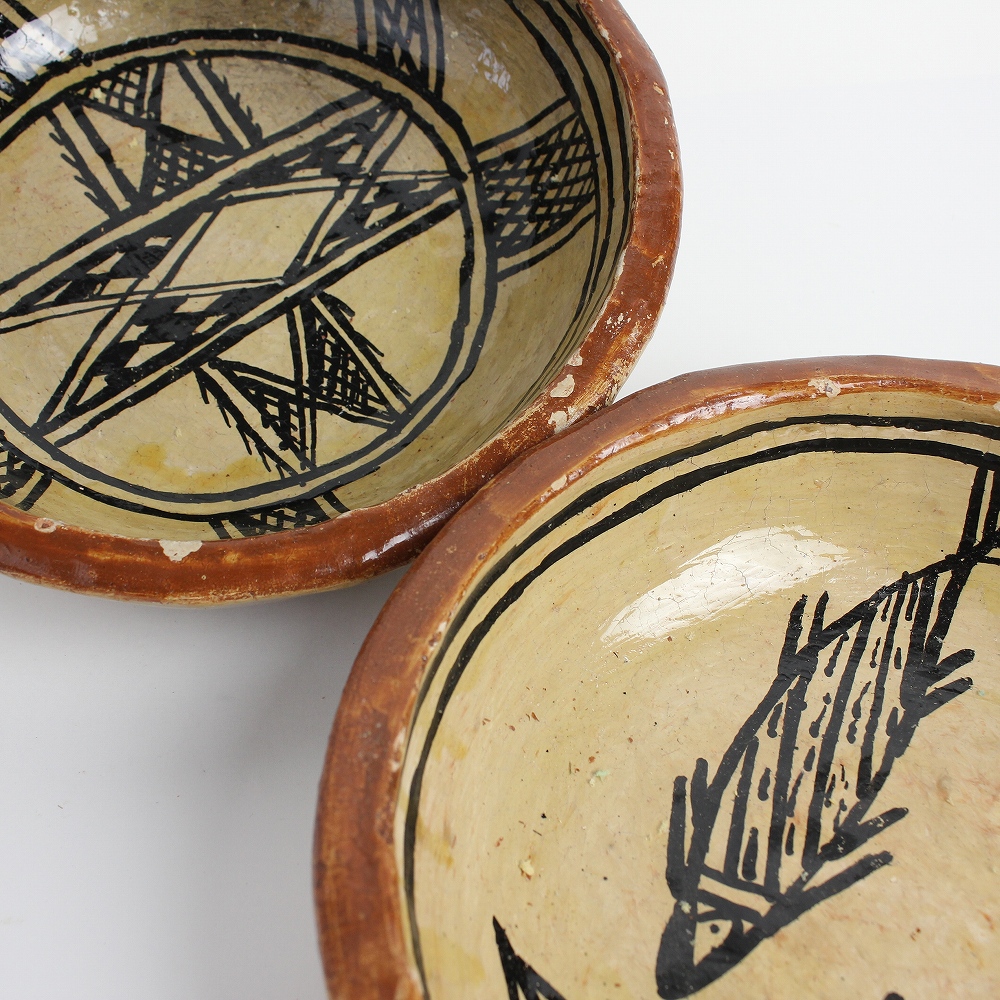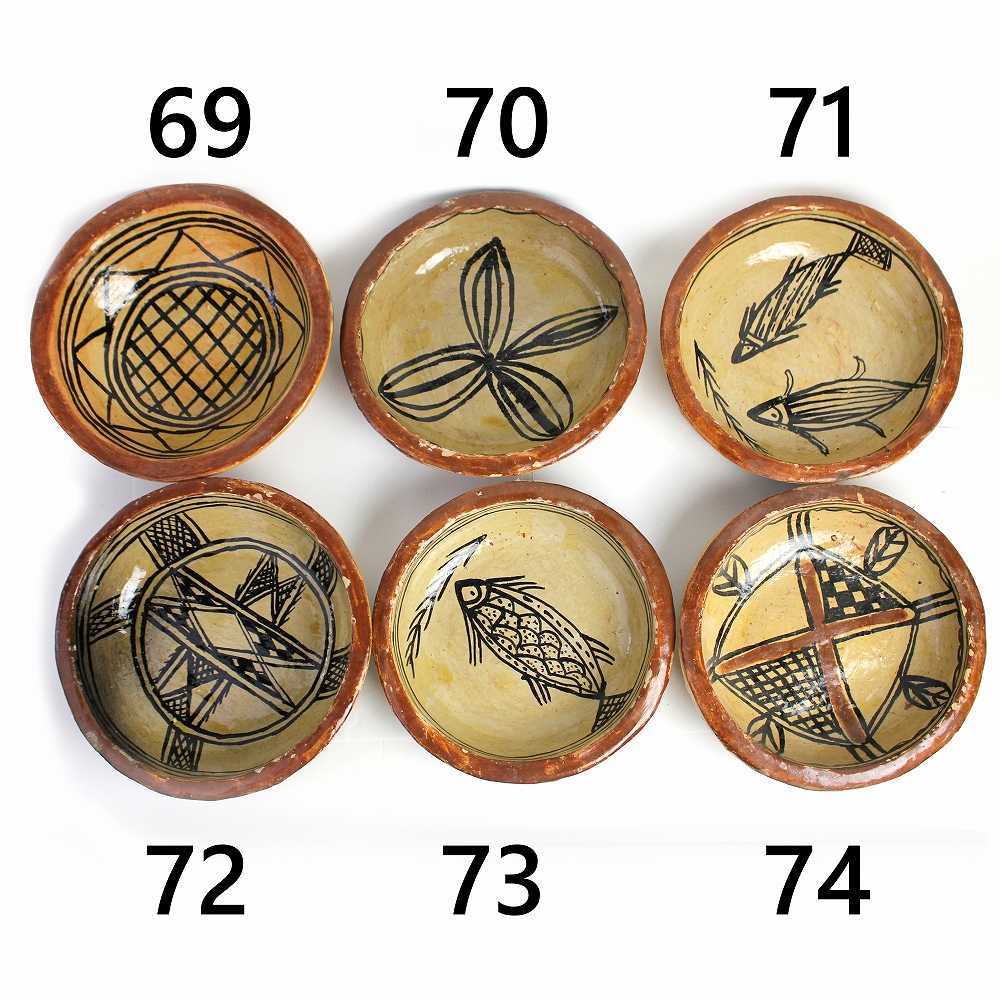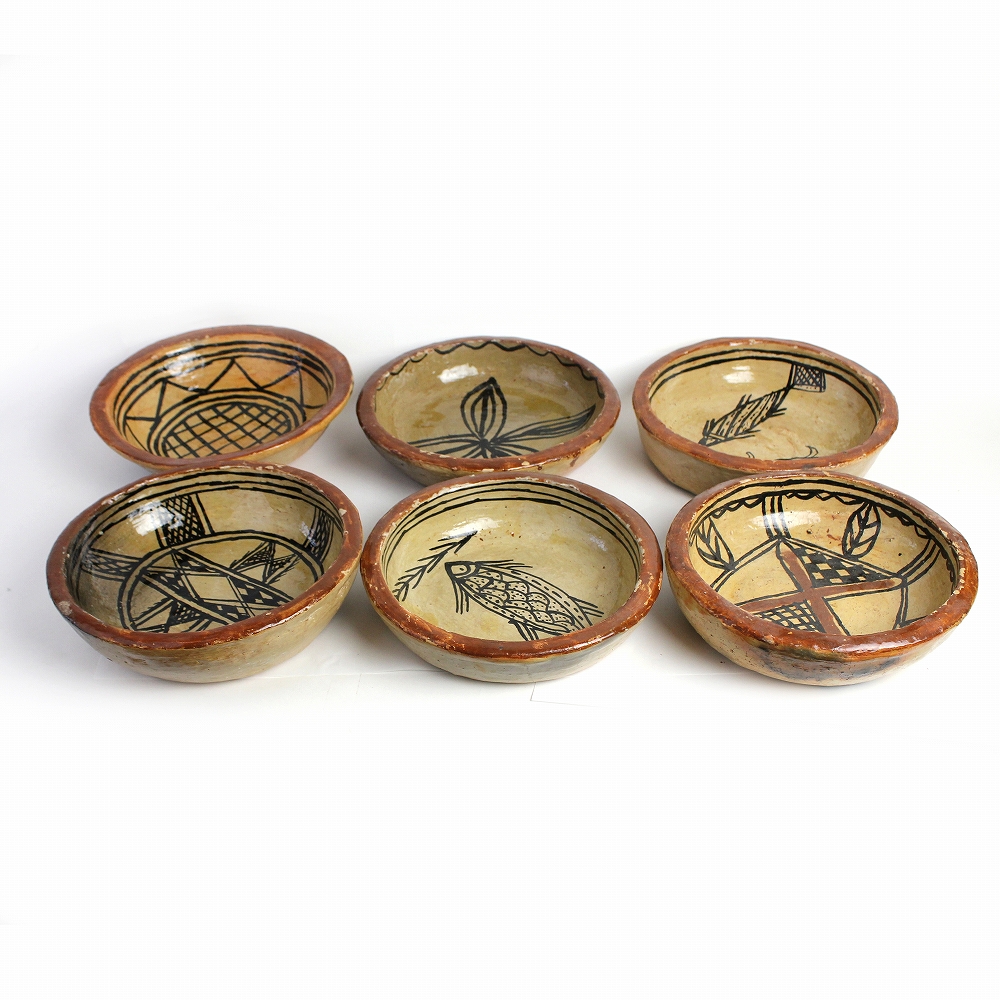 チュニジア北部セジュナン村のベルベルの人たちが作り始めたといわれる、素焼きの中皿一点物です。独特のスタイルの陶器「セジュナン焼き」この陶器は何千年も前からこの地に住むベルベルの女性に受け継がれてきた技術によって焼き上げられるもので、その原始的なスタイルの文化的重要性が認められ2018年にはユネスコの無形文化遺産のリストに掲載されました。多少焼きムラがありますが、ベルベル独自の文様と自然な色合いは見ていて飽きません。存在感あふれるフォルム、ひとつひとつ異なる絵柄からお気に入りをお選びください。インテリアや小物入れに。